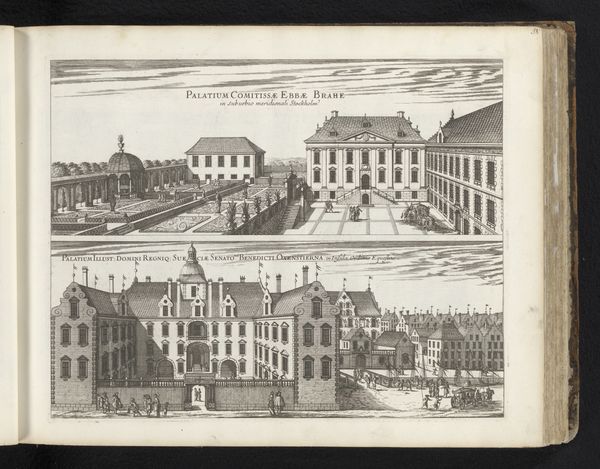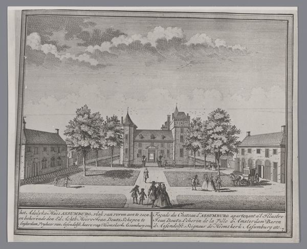 Editor: We’re looking at "View of the Courtyard of the Old Men's and Women's Home in Amsterdam," an engraving by Jacob van Meurs from 1663, currently held at the Rijksmuseum. It’s quite intricate, but the lines are a bit rigid; it feels very formal and precise. What are your initial thoughts when you observe this work? Curator: The engraving immediately draws attention to its formal structure and organization of space. Notice how the artist uses linear perspective to create depth, drawing the eye towards a vanishing point somewhere within the central building. What effect does this have on your interpretation? Editor: It certainly emphasizes the grandeur of the building. It’s interesting how much detail is included. Are there specific elements you think contribute to the piece's success as a composition? Curator: The calculated repetition of windows and architectural features contributes a sense of order and rationality characteristic of the Dutch Golden Age. Further, consider the textures achieved through engraving – the meticulous hatching and cross-hatching, building up tonal variations to define form and space. It is also interesting that the inscription on the building states "old men and women's home." Editor: So, it's less about expressing emotions and more about capturing visual details and geometric precision? Curator: Precisely. Van Meurs masterfully manipulates line and form to create a structured representation of architectural space, reflecting the prevailing aesthetic preferences of the time, without directly engaging an emotional response. What could you tell by only observing the structure in the image, without knowing it represents an elderly home? Editor: It probably suggests a wealthy public entity due to the grandeur of the central building, gardens and balanced perspective, suggesting social order. I’ve never really thought about an artwork with that approach before! Curator: Indeed, focusing on form reveals the artistic intention to produce an orderly, accessible and easily understandable impression of 17th century Dutch life.