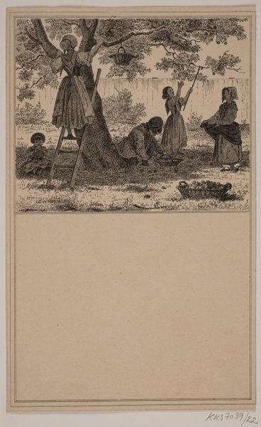 Editor: Here we have Winslow Homer's "Chestnutting" from 1870, a wood engraving. The scene depicts children gathering chestnuts, and it feels like such a classic autumnal image. What do you see in this print? Curator: I'm immediately drawn to the process of its creation. This wasn't painting; it's mass-produced art intended for "Every Saturday: An Illustrated Journal of Choice Reading." Consider the labor involved in translating Homer’s vision into a series of cuts in wood, the mechanics of transferring ink to paper, and distributing it widely. It speaks volumes about the democratizing potential of art, albeit within a capitalist framework. What were the conditions for the children at this time? Editor: That's a great point. Thinking about it as a manufactured object changes how I see it. Were these widely available, and did it change the consumption of art? Curator: Absolutely! This kind of image became available to a broad audience beyond the traditional art-viewing public. Consider how it fueled both popular taste and visual culture. This engraving also offers commentary on child labor: while they are children picking chestnuts for sport here, child labor was a stark reality for many children during this era, blurring boundaries between leisure and toil. Editor: That reframes the image entirely. I was focused on the charming scene, but it’s really highlighting the conditions of labor and access. Curator: Exactly! It shows how everyday activities can mask larger systems of power and the accessibility and process behind producing art for everyone to consume, so they too could experience its inherent materiality, regardless of its context. Editor: Thanks; it really has brought new understanding to the class implications of visual culture in print media.