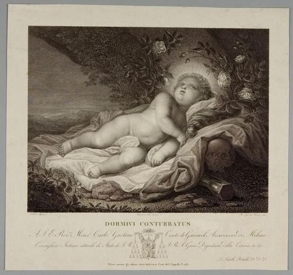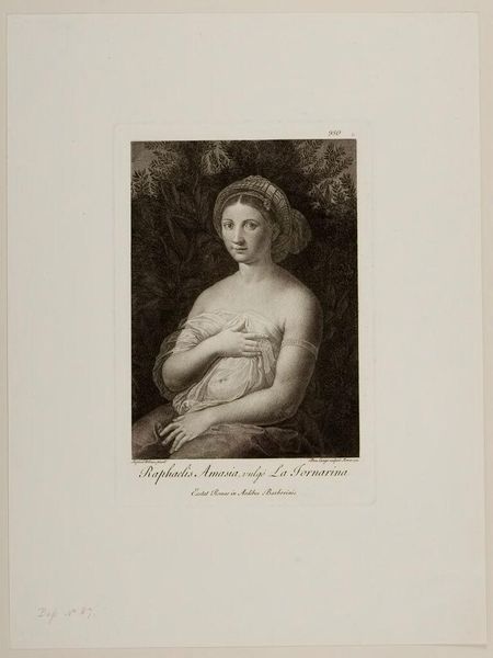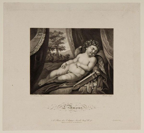 Curator: Look at this engraving, "The Nymph Erigone," by Johann Gotthard Müller. The print depicts a reclining nude figure within an oval frame, reaching for grapes. Editor: She seems totally at peace, but there's also something unsettling about her pose and the slightly claustrophobic feeling of the oval. The grapes give it a Bacchic undertone, doesn't it? Curator: Indeed. Müller, who lived from 1747 to 1830, was a prominent engraver who often reproduced paintings. This one relates to themes of wine, fertility, and transformation in classical mythology. Editor: I wonder about the power dynamics here. Who is gazing, and who is being gazed upon? Erigone's story is one of suicide and despair, so is this a romanticizing of trauma? Curator: It's a complex question. The dedication at the bottom suggests a patron, shaping the work's meaning and reception within a specific social context. Editor: Right, the act of patronage and how that affected the work... It's a glimpse into the art world of the 18th century. Curator: Exactly. The image, beautiful as it is, acts as a window into the social and artistic norms of its time.