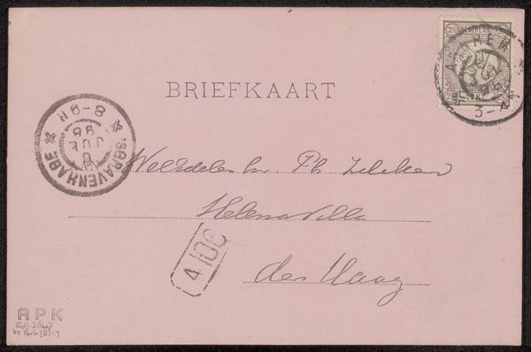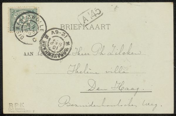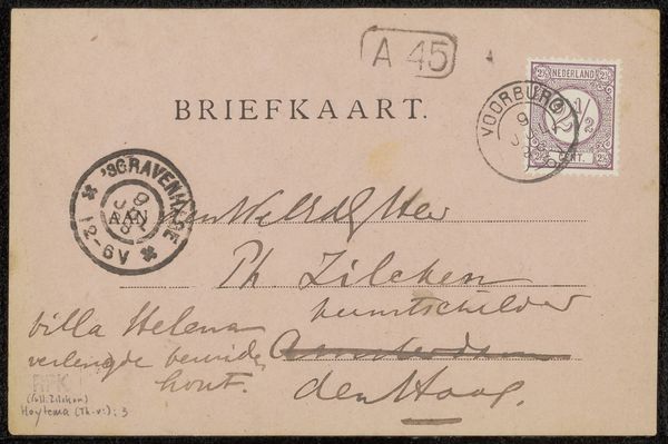 Curator: Ah, a simple postcard. But time transforms the mundane, doesn't it? This is "Briefkaart aan Philip Zilcken," created by Marinus van der Maarel sometime before 1897. It's ink on paper, a pen drawing addressed to someone in The Hague. Editor: It whispers of another era, doesn't it? All sepia tones and faded elegance. The looping script feels almost like a secret code—very intimate, very human. Curator: Exactly! Handwriting as personal glyphs. Notice the franked stamp and postal markings. They aren't just bureaucratic necessities; they are like temporal anchors, fixing it to a moment. The act of corresponding, captured. Editor: Tell me, the circular stamps... are those specific to the Hague? Or are they, perhaps, meant to mimic a rising sun? The sender might want to bless the recipient with daily fresh energy and joy. Or maybe I am going too far... Curator: That's lovely! The specific markings tell us more about the postal system and routes of the time. Those circular seals suggest continuity, but maybe there are personal messages layered within them. An interesting possibility. Editor: It is about time, I believe. Every time the mail carrier stamped something, I believe they confirmed life. With such an eye-pleasing design, it does look more spiritual or like the beginning of everything that we love! Curator: Absolutely. Mail was a lifeline, a tangible link across distance. It makes you think about the anticipation, the tactile connection with the sender... how precious a handwritten word would have been then. It has more impact. Editor: Right. Our digital messages lack the lingering physical echo of a writer's touch. What story this simple "Briefkaart" carries, between sender and receiver is something for us to fantasize! The real life once was within those two that, at least for one moment, time stood still. Curator: And, it offers us an evocative glimpse into their world now. A portal to past lives. It gives something for us in return as well, inspiration or at least imagination. Thank you, past.