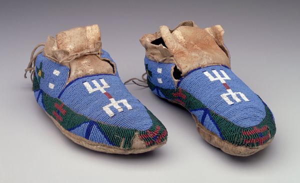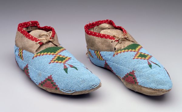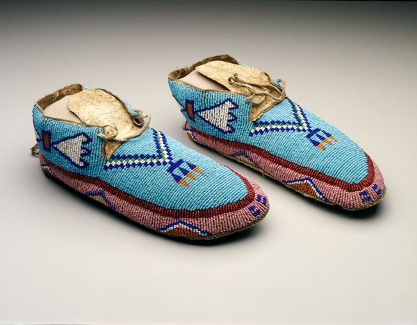 This pair of moccasins, crafted by the Tsistsistas (Cheyenne), presents a fascinating interplay of materials and designs. The tan leather provides a grounded structure, while the intricate beadwork introduces a contrasting texture and visual complexity. The patterns adorning the moccasins invite semiotic interpretation. Vertical stripes in alternating red and blue hues create a rhythmic visual cadence, yet the inclusion of what appears to be a Thunderbird motif disrupts this regularity. Considered a powerful symbol in many Native American cultures, its presence creates a focal point, drawing the eye and mind to potential layers of meaning that go beyond mere decoration. By combining geometric abstraction with culturally significant representation, these moccasins embody an intersection of form and symbolism, inviting ongoing dialogue and interpretation.
