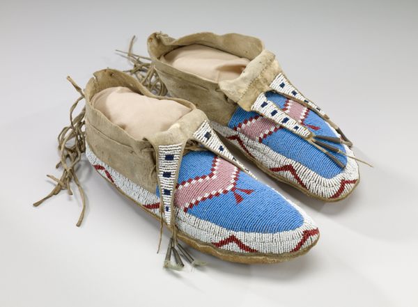 The Tsistsistas are known for their well-crafted footwear, which often have beaded images drawn from traditional life. A red bird has been beaded on the upper portion of the moccasins shown here, referencing the Thunderbird, a being that is important in the Tsistsistas cosmos. Beaded on the other moccasins is a red cross, which does not represent Christianity, instead symbolizes the Morning Star, another figure in Tsistsistas traditions.