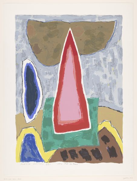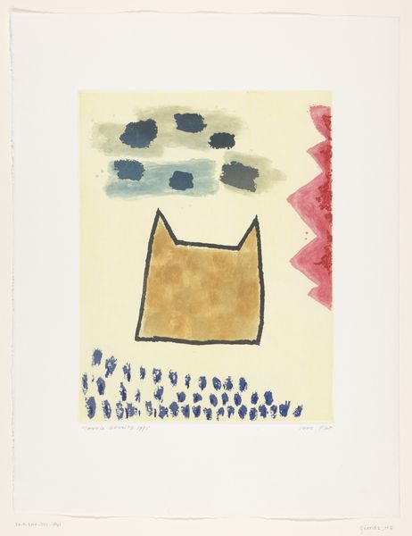 Editor: So, this is "Huis weerspiegeld in water," or "House Reflected in Water," created by Harrie A. Gerritz in 1991. It's a painting or print, I'm seeing acrylic paint maybe. I'm struck by the bold, almost childlike, simplicity and how it juxtaposes with a deeper, almost melancholic mood. What's your take on it? Curator: I see this work within a larger conversation about the representation of domesticity in the late 20th century. The house, an archetypal symbol of stability and family, is here distorted, reflected, almost ethereal. How does the positioning of the house— its near-centrality yet abstracted form— affect your perception? Editor: I think it creates a sense of unease. It’s a familiar image, a house, but the distorted reflection makes it feel less secure, more like a fleeting memory. Curator: Precisely. Consider the socio-political context of 1991. The fall of the Berlin Wall, shifts in global power, a growing sense of uncertainty. Could this image be read as a reflection of those anxieties projected onto the very idea of home? How might the vibrant colors, which seem cheerful at first glance, complicate that reading? Editor: I hadn’t thought of it that way, but that makes a lot of sense. Maybe the colors are a kind of facade, masking the underlying unease. Curator: Yes, art often engages with public sentiment by examining popular imagery. What begins as a seemingly simple landscape becomes a visual commentary on a broader cultural landscape of hope and anxiety. Do you see a tension between the private and public? Editor: Definitely! I see the private sphere is the house, and how the social sphere might intrude in and shake things up, changing your reflection. Curator: A powerful observation! It encourages me to think about the constant negotiation between our private lives and the larger world around us. Editor: This was really insightful! I'll never look at a "simple" landscape the same way again.