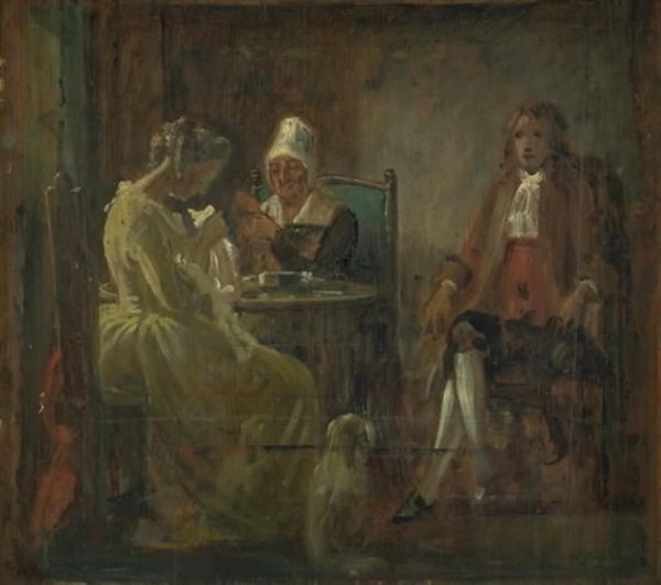 Editor: This is "Le Récital," circa 1900, by Jean-Louis Forain, an oil painting. The figures are kind of shadowy, the palette muted, but the overall impression is very cynical and observant of the human condition. What's your read on this painting? Curator: Well, considering Forain's position as a chronicler of Parisian life, particularly of the bourgeoisie, this piece functions as social commentary. How do you perceive the arrangement of the figures, their relationships within that social framework? Editor: I notice how some are clearly focused on the singer while others seem completely detached, almost bored. Curator: Exactly! It reflects the changing social dynamics of the period, with rising skepticism towards traditional forms of entertainment. Think of the emerging café-concert culture and its challenge to formal opera. The anonymity given to the observers is as potent as her exposed form. The gaze is up for grabs. Editor: It almost feels like Forain is questioning the sincerity of the performance itself. Is he saying something about art becoming a commodity? Curator: Precisely. He uses Impressionistic brushstrokes to give this genre painting a modern edge, turning the very act of witnessing art into the subject matter. Are the patrons truly appreciating the music, or is it just another social obligation, another status symbol to flaunt? Editor: I hadn't thought of it that way. It gives the painting so much more depth. Seeing it as commentary makes you rethink its relevance. Curator: Indeed. "Le Récital" becomes a mirror reflecting the complex relationship between art, society, and individual perception in turn-of-the-century Paris, not just an impression of such. We have, by studying context, brought it closer to contemporary discussion.