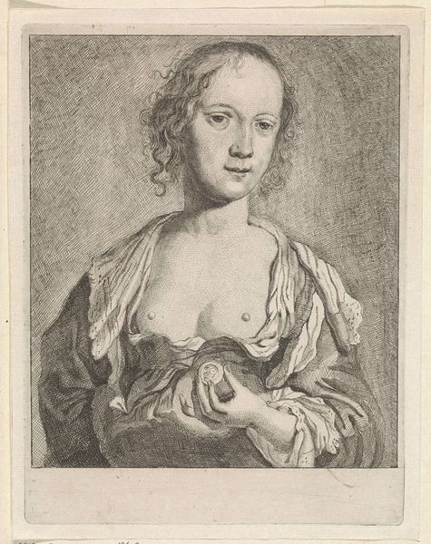 Dirk Jurriaan Sluyter made this portrait of a woman with engraving in the Netherlands during the 19th century. The woman's pose suggests a moment of candid intimacy, yet this is belied by the formality of the engraving. The bare shoulders and loose fabric may reflect a Romantic interest in the natural and the sensual, yet the engraving medium, with its roots in reproductive printmaking, speaks to a wider market for images and the increasing commodification of art. The Dutch art world of the 1800s was shaped by the legacy of its Golden Age and by the pressures of industrialization. Artists like Sluyter navigated a changing landscape, balancing tradition with innovation and the demands of the market. Art historians consult a range of sources, from exhibition reviews to economic data, to understand the complex forces that shaped art in its time. Ultimately, the meaning of this portrait lies not just in its aesthetic qualities, but in its relationship to the society that produced it.