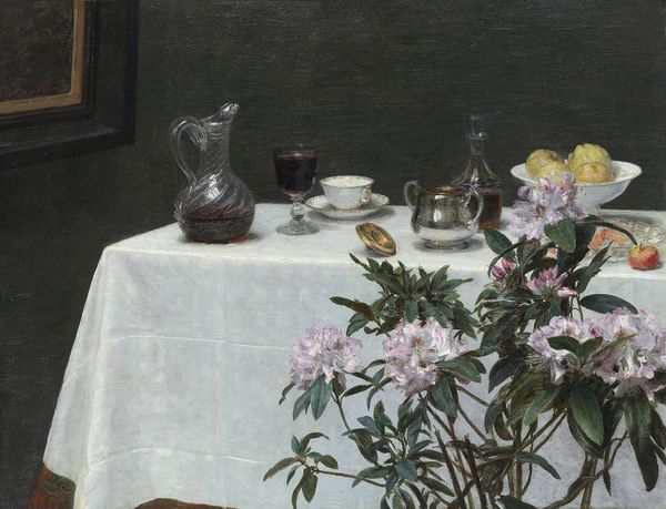 Editor: So here we have "Still Life with Ham" from 1650, by Gerret Willemsz Heda, created with oil paint. What strikes me is how… edible everything looks. Like, if I reached into the canvas, I could grab that roll. It’s also impressive how Heda captured the different textures, from the shine of the metal to the softness of the linen. What catches your eye when you look at this piece? Curator: It makes my stomach rumble! Seriously though, what I find captivating about Heda is how he finds the extraordinary in the ordinary. Look at how the light glances across the pewterware, and the subtle contrast between the almost photographic rendering and those pops of expressive brushwork. Dutch Golden Age still lifes weren’t *just* about showing off wealth – they were loaded with symbolism, often with a moralistic undertone. See that half-eaten ham? Editor: Yeah? Curator: That reminds us that earthly pleasures are fleeting. The tilted glasses suggest… perhaps too much merriment? What do *you* think? Editor: Interesting! So, it's not just a pretty picture of lunch. It’s like a reminder to practice moderation? It does make you wonder who left the scene. I imagine a guest excusing himself, perhaps a bit tipsy, for a quick smoke… Curator: Precisely! Heda elevates something incredibly familiar into a contemplation on life and mortality. He makes us think – what is *truly* nourishing? And how easily do we succumb to excess? It is amazing that centuries later this scene invites these sort of wonderings and discussions. Editor: I’ll never look at a ham sandwich the same way again. I appreciate seeing how art from the past offers reflections about the present.