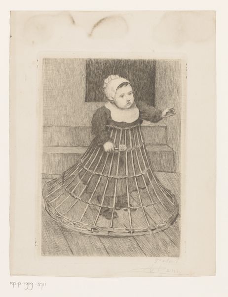 Curator: Welcome. This engraving is titled "Portret van een onbekend kind," or "Portrait of an Unknown Child" and its creation dates between 1815 and 1862. The technique is remarkable. Editor: It strikes me as rather melancholic. The subject's averted gaze, combined with the monochrome medium, evokes a sense of introspection and perhaps even social unease. It begs the question, what was childhood like in this period, and for whom? Curator: Indeed. Let's consider the socio-economic context in which it was produced. Engravings, like this one, circulated widely, democratizing images and ideas, so its availability for scrutiny would be wide reaching. The intricate hatching and cross-hatching create tonal variations, indicating a highly skilled printmaker. The paper itself—its likely provenance, quality, and cost—tells us something about the intended audience, too. Editor: Exactly! And looking at the child’s clothing – the fancy hat and the cherries hanging from their waist – this isn’t just *any* child, but rather a clear marker of elite status, and an exercise of class and privilege in a world increasingly impacted by industrialization. The clothing might even be staged or an idealized marker of gender itself! Curator: Good points. Considering these details brings the print into a broader narrative of representation and social messaging. There is likely an interesting link here between art as an indication of belonging and aspiration to the middle classes who may buy the engraving to demonstrate belonging. Editor: And perhaps more. This child is shown in isolation—where are the parents? It provokes me to wonder how the artwork plays into the discourse around childhood innocence or corruption, ideas rooted in patriarchal societal expectations and perhaps ripe for intervention? Curator: Well, looking at this, the artistry, skill, craft and commercialisation that are brought together to achieve this is a feat in itself and shows an interesting connection. Editor: A connection with ongoing ripples into modern issues. Ultimately, what this work leaves me pondering is the complex power dynamics embedded in even the seemingly simple representation of a child. Curator: Absolutely, and by extension, the labor and materials required to disseminate such representations to wider audiences. Editor: It is this conversation—historical material realities and art’s role in shaping identity—that makes analyzing this print so rewarding, don't you agree?
