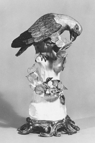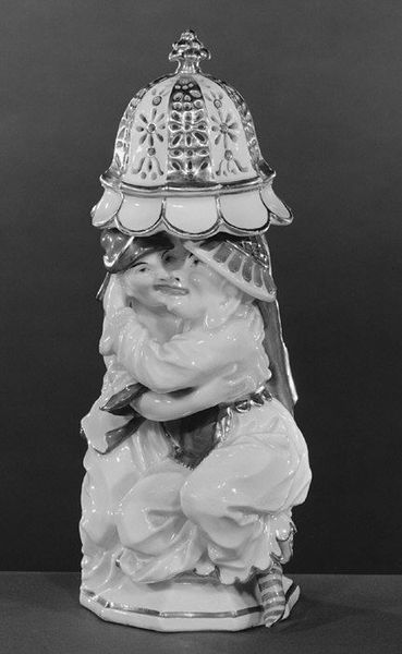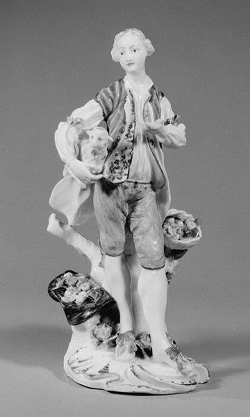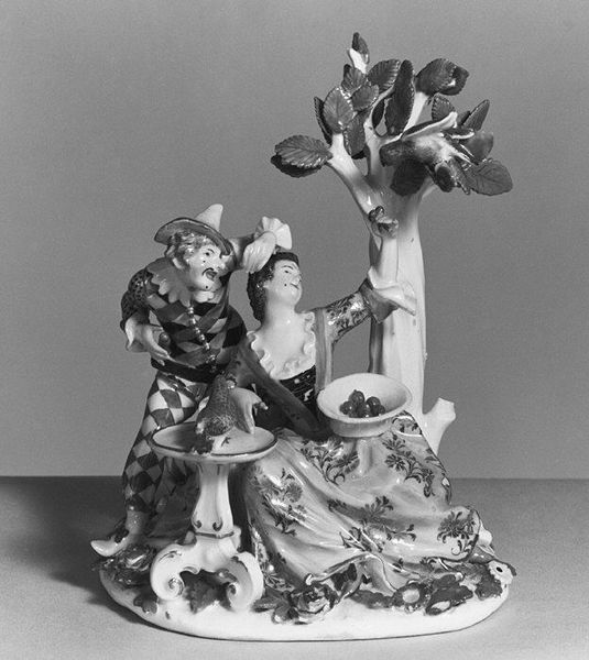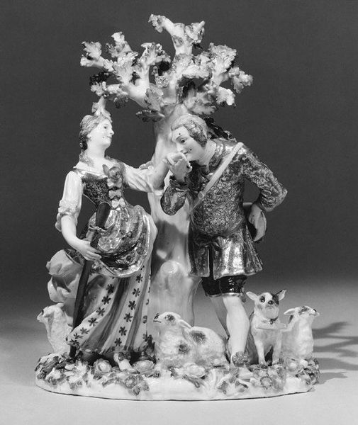 Editor: This is "Shepherd Lovers," a porcelain sculpture created by the Meissen Manufactory between 1737 and 1750. It depicts a couple in pastoral attire, and something about its fragility and detailed craftsmanship really strikes me. What stands out to you? Curator: I immediately think about the process of production. Consider the resources, the labour division in the Meissen factory – from mining the raw materials to the highly skilled painting. Was there a hierarchy of labor impacting the creation of the piece? Editor: That's interesting. So, instead of focusing on the artistic genius, you are more interested in the whole production ecosystem? Curator: Precisely. The Rococo style often depicts idealized scenes of leisure and romance, but who had access to those commodities, and at what cost? Porcelain was extremely valuable. Think about the accessibility of this subject represented in such expensive material! This is decorative art intended for aristocratic patrons. What implications did its display have on its wealthy consumers? Editor: Right, it was a luxury item representing leisure, owned by people with privilege, manufactured by underpaid workers. Was the making of porcelain pieces always viewed as "art" production, or something else? Curator: That is an important point. The materials used, porcelain and ceramic, also invite this reflection. Were these porcelain figures valued differently than bronze sculptures, for example, due to how ordinary people related to these materials? And who decides where it would be exhibited, a curiosity cabinet or a museum? These distinctions reinforce power dynamics. Editor: It's fascinating how looking at the materials and labor involved changes the way we understand the sculpture's message and purpose. Thanks for sharing this materialist perspective, it really helped to expand my knowledge. Curator: My pleasure! It's important to critically analyze the system within which an artwork is conceived and created, going beyond what's immediately visible.
