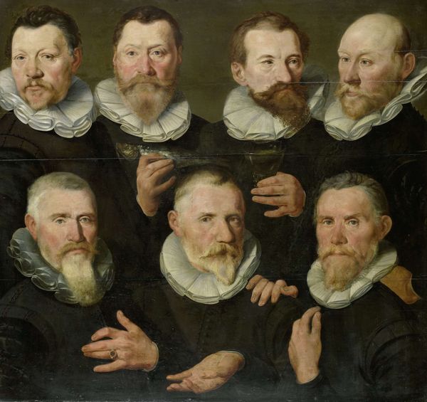 Painted around 1650 by Jacob Backer, this imposing oil on canvas presents the regents of the Nieuwezijds Institute in Amsterdam, their solemnity set against a muted backdrop. The painting's formal arrangement reveals a deliberate structure. Notice the somber color palette, dominated by blacks and browns, which lends a serious tone fitting to the subject. The figures, arranged around a table, are carefully positioned to create a sense of balance and order, yet there's a slight asymmetry that prevents the scene from feeling static. Backer’s attention to the texture of fabric and skin adds a layer of realism, contrasting with the more abstract, undefined background. Consider the semiotic weight of the clothing. The uniformity of attire speaks to a shared identity and purpose, emphasizing the regents' collective authority. This visual language is crucial in understanding how the painting communicates power and social cohesion in Dutch society. The composition challenges fixed notions of portraiture, blurring lines between individual and collective representation. Ultimately, Backer’s masterful rendering of texture and form serves not only aesthetic purposes but also invites us to explore deeper questions about representation, authority, and the construction of social meaning.