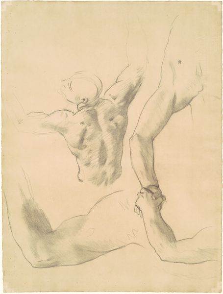 Curator: This drawing, currently residing in the SMK - Statens Museum for Kunst, is titled "Anatomical Study (écorché). Standing flayed man seen from the back half turned to the left, his left arm raised." It’s attributed to Willem Panneels and dates back to between 1628 and 1630. Editor: My immediate reaction? Stripped bare. It’s confronting to see the human form rendered in such a raw, exposed way. You can almost feel the tension in the raised arm. Curator: Indeed. The écorché – the flayed figure – has long been a tool in artistic training, a symbol not just of mortality but also of hidden knowledge. It exposes the "machine" beneath, aligning with a growing fascination with science and the physical body. Think of it as the artistic quest to understand the spiritual, by understanding how it manifests in matter. Editor: That quest relied heavily on available materials and modes of production. Consider the physical act: Panneels uses pencil and charcoal, humble materials, to render something so complex. There's an almost clinical process at play, an unemotional survey. It points to an increased focus on scientific knowledge accessible to the artistic workshop. Curator: Precisely. This piece isn't merely an anatomical illustration; it taps into deep-seated anxieties about human existence, while also showcasing the mastery of academic artistic traditions and the pursuit of ideal forms through detailed observation. It’s part history painting in potential, part formal exercise, exploring form and its impact. Editor: Absolutely. The historical context would definitely have affected how it was consumed too. Knowledge about the human body shifted through early dissections performed for medical students, creating space for artwork like Panneels'. It allowed new understandings of physical realities for artists. Curator: We can think of this anatomical drawing not as an image of decay but of potential, reflecting a time when science and art were becoming ever more interwoven. The peeled away layers signify the revelations beneath. Editor: A fascinating look into art as labor, as research, not merely creation. The intense physicality within the subdued lines provides insight into shifting practices of art making itself.