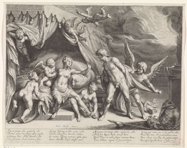 Curator: Johann Sadeler I created this engraving, "Christus in het voorgeborchte: 'die nedergedaald is ter helle, de derde dag verrezen uit de doden'," in 1579. Editor: The chaotic energy really grabs me! It feels like a literal descent, a visual depiction of breaking through earthly constraints, made all the more poignant by the medium of print and the labor invested in it. Curator: The composition reflects theological debates of the time, portraying Christ's descent into Limbo to liberate righteous souls—an apocryphal story not found in all Christian traditions. Notice the clear division: above, damnation, and below, liberation through Christ's sacrifice. Consider its relationship to societal structures... who benefits from emphasizing these binary power dynamics? Editor: Right, and seeing it as an engraving reminds me how these images would have been reproduced and disseminated. We need to remember the workshop processes, the artisan's hand tracing these theological concepts. The sheer repetition underscores the religious doctrines in early modern European society, while also thinking about printmaking as an important element to artistic dissemination. Curator: The positioning of Adam and Eve to the right, juxtaposed with those shackled in darkness, creates an interesting tension. It speaks to prevailing beliefs about original sin and redemption within the confines of Northern Renaissance aesthetics. How does seeing them positioned at the margins influence our perspective of their roles within this theological structure? Editor: Absolutely! And consider the materials – ink, paper, the metal plate from which this comes. These weren't passively consumed; they were circulated, traded, and owned. I would love to research the engraver's influences as well! Curator: It is a powerful visual translation of complex theological narratives, indicative of the Reformation era’s preoccupation with sin, redemption, and judgement. Editor: Exactly. Seeing how meaning and belief are physically pressed onto a surface—it helps demystify some of the lofty symbolism and reveals the means of production that perpetuated it. I feel that offers a different perspective on the narrative.