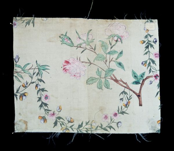 Editor: This is an anonymous silk headscarf with a floral pattern, probably made sometime between 1940 and 1950. It feels very delicate and handmade. I’m struck by how the floral design is arranged; it's like each corner holds a little bouquet. What connections can you make looking at this work? Curator: The strategic placement of these floral groupings evokes a sense of both closure and openness. Imagine the headscarf draped. These 'bouquets' then frame the face, echoing perhaps a desire for protection but also revealing something. Notice the variety within repetition - small colour variations hinting at personal touches. Editor: I see what you mean. The slight variations make it feel more human, less mass-produced. And that edge, the little looped fringe, adds a layer of tactility. Could the choice of Oya flowers hold significance? Curator: Precisely! Textiles in this era were very often imbued with specific meanings tied to cultural memory. Oya flowers, often used in headscarves, signify, amongst other things, swift change and new beginnings, echoing transformations perhaps. Think about what kinds of changes this maker lived through during those decades? Editor: So, it's not just decorative but deeply symbolic. It reminds me how everyday objects can be powerful carriers of cultural narratives and personal experience. I wouldn’t have considered the link to a sense of protection or new beginnings without your insight. Curator: Indeed. The most ordinary image becomes charged when you start thinking about what they might have represented in lived experiences, continuing a visual language across generations. Hopefully now you might see just a little bit more when encountering these recurring motifs and themes again? Editor: Absolutely. Thanks, I learned a lot looking at this piece today.