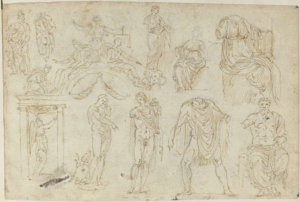 Curator: This is Thomas Stothard's "Studies of Kneeling and Recumbent Figures, after Raphael" which is held here at the Tate. Editor: It feels quite immediate, like a glimpse into the artist's mind at work, all captured in spare pen strokes on this relatively small support. Curator: Stothard, who lived from 1755 to 1834, clearly revered Raphael. This piece reflects the broader cultural moment that looked back to the Renaissance for artistic inspiration and legitimacy. Editor: I'm drawn to the materiality. The ink, the paper...these were accessible materials, allowing Stothard to rapidly iterate and explore form and composition. A very humble, almost utilitarian aesthetic. Curator: Absolutely. Stothard's studies provide insight into how artists appropriated and adapted historical styles to meet the aesthetic demands of their own era. Editor: The labor is evident in the sheer number of figures he sketched, the build up to something more finished. This gives us an intimate look at the artist's process, as an artisan. Curator: Indeed, it opens a window into art's evolving role within society, from its function as a means of production to an emblem of cultural refinement. Editor: I like how you bring those ideas to life through this unassuming drawing. Curator: It's important to remember art's place in history. Editor: And its making!