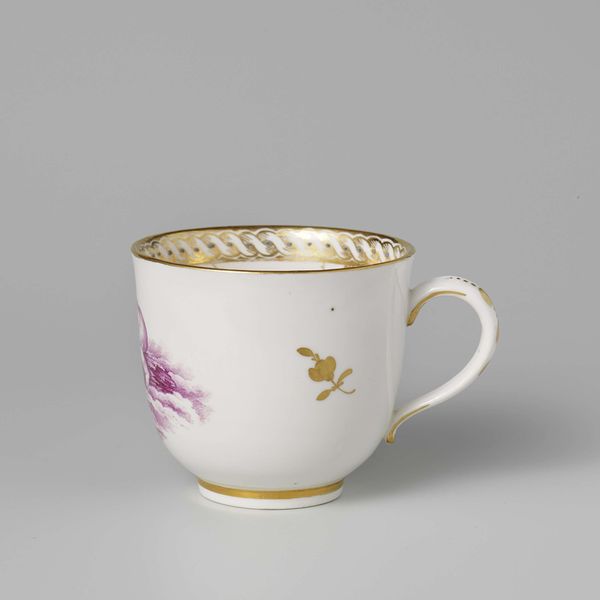 Editor: Here we have a porcelain cup and saucer crafted by the Königliche Porzellan Manufaktur around 1813, aptly named "Cup with 1813." It's the contrasting blocks of deep blue and the glittering gold that really grab my attention. How do you interpret its design elements? Curator: Focusing purely on the aesthetic properties, observe the juxtaposition of the matte cobalt blue exterior against the gleaming gold interior and trim. The smooth, uninterrupted surface of the cup is punctuated by gilded, stylized foliate designs. The saucer disrupts that, however. Note the printed, seemingly topographical design and how its geometry conflicts with the foliate scrollwork of the cup. Editor: That contrast is definitely striking! It feels almost like two separate aesthetics coexisting on the same object. Curator: Precisely. Consider, also, how the form dictates the viewing experience. The cup, held in the hand, invites intimate inspection of its surface and weight. The saucer, typically seen horizontally, provides a broader tableau, flattening the graphic. What does this two-part structure suggest to you? Editor: It's like one element focuses on tactile and sensory experience while the other introduces more abstract conceptual features. Curator: A good observation. It provokes an interplay of volume and surface, intimate handling and detached viewing. The addition of "1813" complicates the piece in a way that pulls attention to a specific historical context, which is also something that disrupts its pure design and moves us from admiring form, line and shape to the context in which the artwork existed. Editor: So, by studying form and juxtaposition, we can learn a lot. Thanks! Curator: Indeed. Visual analysis can unlock many entry points to understanding a work.