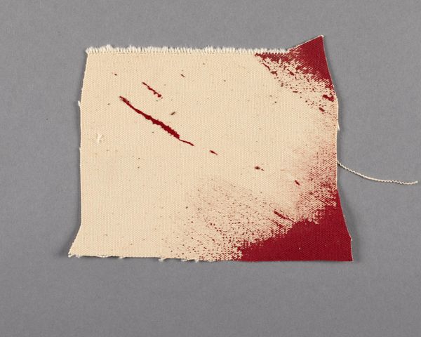 Editor: Here we have Barnett Newman's "Painted Canvas Fragment." It’s a small, irregular piece with bold red paint against bare canvas. What strikes me is the raw edge, the abruptness of the color shift. What do you make of this fragment? Curator: Its power lies precisely in its fragmentariness. The push and pull between the raw canvas and the applied pigment establishes a binary. The canvas grain itself, as an element of structure, contributes to the overall tension. Editor: Tension between what, exactly? Curator: Between the intentionality of the artist's gesture and the inherent qualities of the materials. The composition is reduced to its most fundamental elements. Editor: So, it's about the dialogue between the paint and the canvas, the made and the unmade? Curator: Precisely. It compels us to consider the very essence of painting. Editor: That’s a fresh perspective. I was too focused on what might be missing, rather than what *is* present.