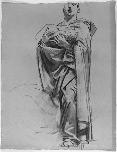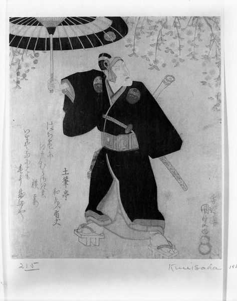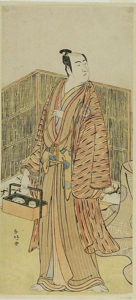 Curator: Looking at "Beauty with Letter," a striking print by Kaigetsudō, likely created sometime between 1800 and 1868, what's your first reaction? Editor: The bold lines are captivating. It's an arresting image. I am particularly struck by the figure's almost solemn poise. The heavy black robe makes a dramatic statement against the muted backdrop. It projects elegance, yes, but also… a certain world-weariness, perhaps? Curator: That black robe is significant. It’s a visual anchor, certainly, but also a signal. The flowing silhouette is characteristic of the Kaigetsudō school, known for its iconic depictions of courtesans. The choice to render the figure's clothing in this striking manner wasn’t merely stylistic; it was a calculated move that reinforced their unique brand of feminine beauty within ukiyo-e traditions. Editor: So, more than just artistry; it's savvy marketing through visual symbolism! The figure becomes, in essence, a walking advertisement, embodying and propagating a particular standard within a rapidly evolving cultural landscape. It prompts the questions about female representation during that time. To what degree were women shaping their own image? Curator: Exactly. While these prints offered a seemingly diverse representation of women in popular culture, they simultaneously participated in constructing a very particular vision. This iconography perpetuated an elevated view of the courtesan's role in society. It presents a complicated narrative: empowering yet constrained. Editor: That resonates with what is known about print culture and the star system of actors and performers during that time. So how might the letter held in her hand play into this narrative? Is it a personal missive or a further tool to enhance allure, like a staged photograph from a later period? Curator: It’s another layer of narrative, inviting us to contemplate the personal life beyond the beautiful figure presented for public consumption. We might see this figure not just as a representation of beauty but as a businesswoman, a woman navigating a complex societal role in an evolving world, one strategically deploying signifiers of status. The artwork then becomes an artifact embedded within its culture, allowing us glimpses of complex female agency at a specific moment. Editor: The print, by documenting that strategic deployment, helps to reconstruct this vision for audiences centuries later. That bold black robe has quite a lot to tell. Curator: Indeed. The careful observation reminds us of the depth encoded in seemingly simple images, waiting to be unpacked.