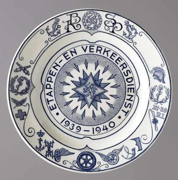 Curator: Here we have a delightful piece of earthenware: a commemorative plate from 1936 titled "Herinneringsbord bij de verloving van prinses Juliana en Bernhard van Lippe-Biesterfeld, 8 september 1936," made by De Porceleijne Fles. Editor: Oh, it's so sweetly earnest! That classic blue and white... Makes me think of cozy kitchens and proper announcements. Sort of feels like a flowery telegram declaring, "They're getting hitched!" Curator: Precisely! The symbolism is rather overt, isn't it? The central basket brimming with flowers representing fertility and new beginnings is framed by the initials "J" and "B" entwined with hearts around the border, announcing their union. Editor: Those simple repeating motifs are really grounding, almost hypnotic, reinforcing that very Victorian sense of order. But look at the flowers – they're not realistically rendered; they’re more symbolic, dreamy… suggesting more than just the obvious 'love and happiness.' Curator: That stylized approach reflects the ongoing influence of Dutch Golden Age design principles. Even in the 20th century, we see a deep connection to heritage—a visual assertion of stability through tradition, even as the world was changing rapidly. This plate whispers of continuity, promising stability amidst uncertainty. Editor: Yet there's a handmade quality, an innocence about the imperfection in the painting. Like a hopeful folk song. This earthenware feels very humble, not at all presumptuous despite the Royal subject matter, and I think it becomes almost accessible this way. You want to grab it, like holding on to joy, you know? Curator: Indeed. The tempera finish is vulnerable as well, unlike high-gloss modern ceramics—its ephemerality quietly mirrors life’s own transience, so that love may become more tangible even as its presence on display slowly diminishes into dust, fading away by slow degrees… Editor: Hmm. Maybe that is what moves me, then. Thank you for bringing this memory object alive with the light that is still within it. Curator: It’s been my pleasure, and may that engagement blossom to you as well.