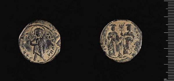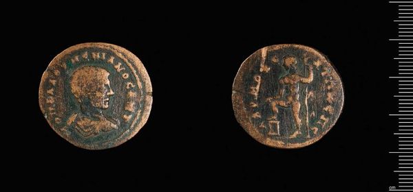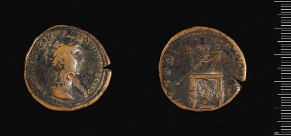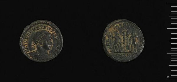 Curator: The "Follis of Constantine I, Antioch," reveals an intriguing glimpse into ancient monetary art. What strikes you immediately about this piece? Editor: Its worn texture and earthy tones suggest a tangible link to the past, a silent witness to history. Curator: Indeed. Coins like this served not only as currency but also as potent symbols of imperial power. The portrait of Constantine I, for example, embodies authority through carefully rendered details. Editor: And the imagery on the reverse, what does it signify in the broader context of Constantine's reign? Curator: Ah, it depicts the Genius of the Roman People flanked by personifications of the cities, a powerful visualization of unity and prosperity under his rule. Each element, from the inscription to the figural composition, reinforces the emperor’s message. Editor: A small object, yet it speaks volumes about the politics and aesthetics of its time. Curator: Precisely. It's a compelling artifact, inviting us to consider the multifaceted role of art in shaping perceptions of power. Editor: It prompts reflection on how meticulously crafted images, even on such a minute scale, played a crucial role in shaping collective identity.