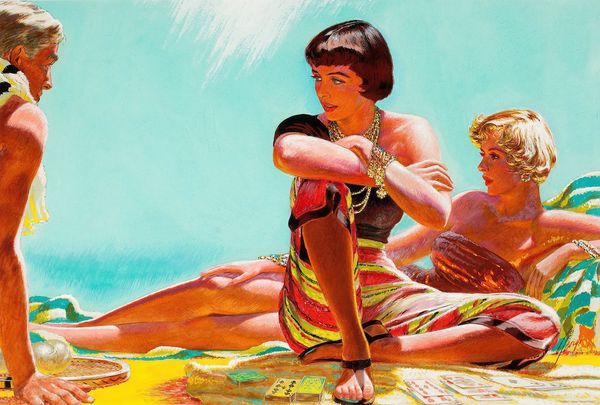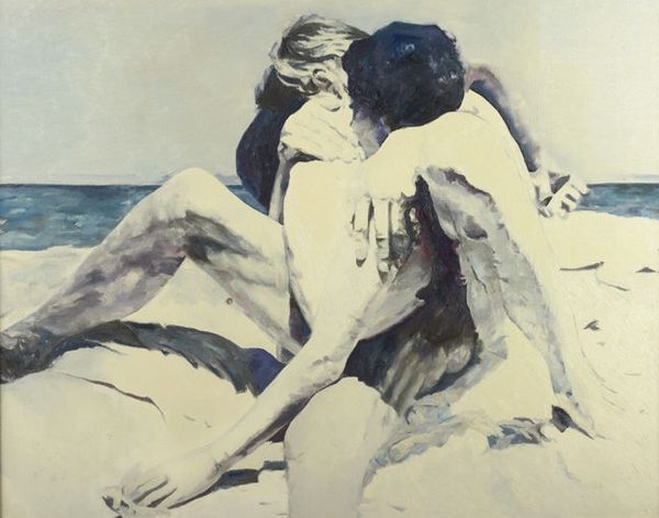 Curator: Here we have Eric Fischl’s “The Old Man’s Boat” completed in 1982. The medium, as is apparent upon closer inspection, is oil paint on canvas. Editor: It’s…unsettling. The abrupt shifts in scale and the uneasy contortions of the figures are hard to ignore. Curator: Absolutely. Fischl, deeply entrenched in the Neo-Expressionist movement, directly grapples with societal norms and anxieties. Note how he strategically wields oil paint to depict the complexities of human relationships set against a background rife with ominous undertones. This particular composition places viewers as indirect participants, seemingly invading an intimate and awkward moment aboard this boat. Editor: From a purely formal standpoint, the application of paint is masterful. The juxtaposition of colors, the composition, and use of negative space all guide the viewer’s eye around the canvas to focus on the interactions occurring. It is, for lack of a better word, a disturbing intimacy. The dog looks distressed! Curator: Consider also how the nude figures on the boat contrast with the implication of wealth suggested by the location. The presence of luxury is in tension with the unadorned bodies. Fischl uses the figures as subjects and objects simultaneously, bringing forward their physicality. Editor: Exactly, that tension becomes a narrative in and of itself. It's a statement about leisure, privilege, and the performative nature of relaxation. The bodies become landscapes, contoured and lit to draw out emotion—both the visible and hidden ones. Curator: And one cannot discount how this artwork functions as social critique. By confronting conventions, Fischl questions cultural scripts and prompts us to interrogate assumptions. "The Old Man's Boat" is therefore an artifact and agent, revealing as much about the eighties and production in general as it reveals something new each viewing. Editor: True. Examining it today brings to mind many issues and problems regarding representation in visual art, the complex layers present only growing richer over time. Thanks for drawing that all to my attention!
