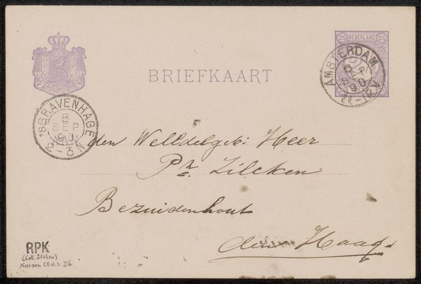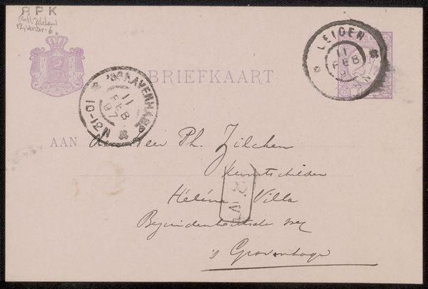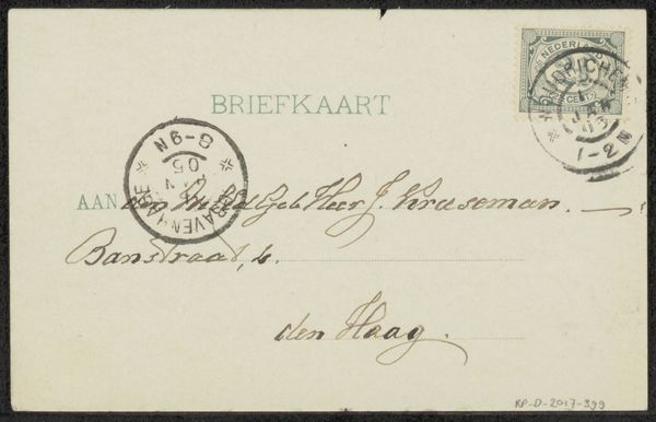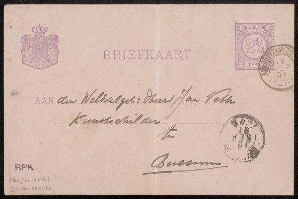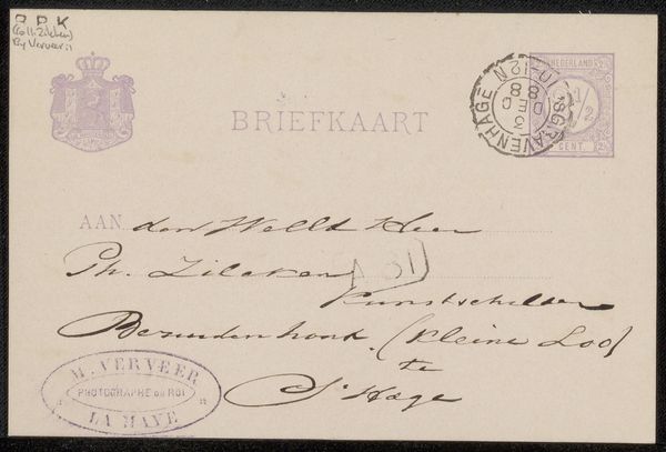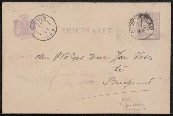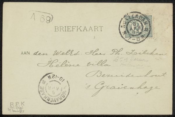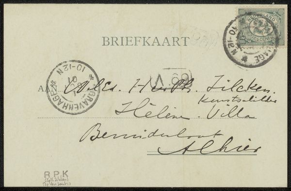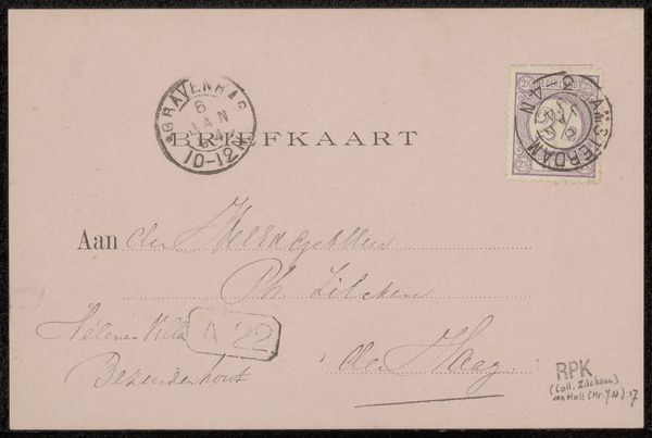 This Briefkaart aan Jan Veth was sent by George Hendrik Breitner in 1887, likely from Amsterdam. It’s made from a simple piece of card, and the postal markings tell a story of industrial efficiency, using standardized fonts and machine-applied stamps. The card itself, though seemingly humble, speaks volumes about the changing nature of communication in the late 19th century. It highlights the contrast between the mechanization of the postal system, and the handwritten, personal message. You can see the traces of the sender's hand, in the penmanship, which connects us to the artist in an intimate way. The card is a reminder of the labor involved in communication before the digital age – from the production of the card itself, to the postal workers who physically transported it across the city. This piece blurs boundaries between the public and private, the mass-produced and the handmade, making us rethink traditional notions of fine art.