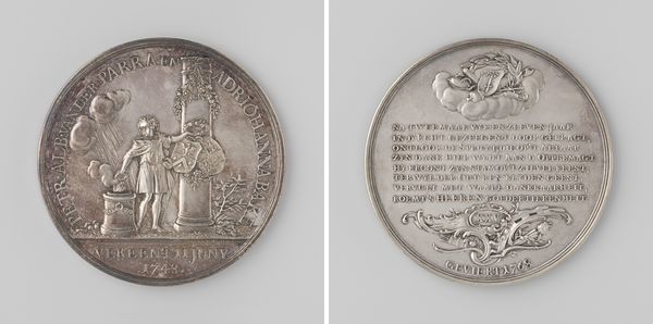 This silver medal was crafted by an anonymous artist to honour J. Root, Director-General of the Dutch West India Company. Its circular form is bisected into two distinct, yet related scenes, each employing symbolic language to convey its message. On the left, notice how the heraldic shield with three horns sits above an inscription, framed by intricately designed ribbons. This side speaks to authority and recognition, using formal emblems to denote status and achievement. Turning to the right, we encounter a seascape with ships battling turbulent waves. The composition here is dynamic, illustrating the challenges and power associated with maritime trade and exploration. Together, these halves present a duality: the structured world of governance versus the unpredictable forces of nature and commerce. The medal functions as a semiotic device, where each element contributes to a larger narrative about Dutch colonial ambition, and individual accomplishment within this historical context.