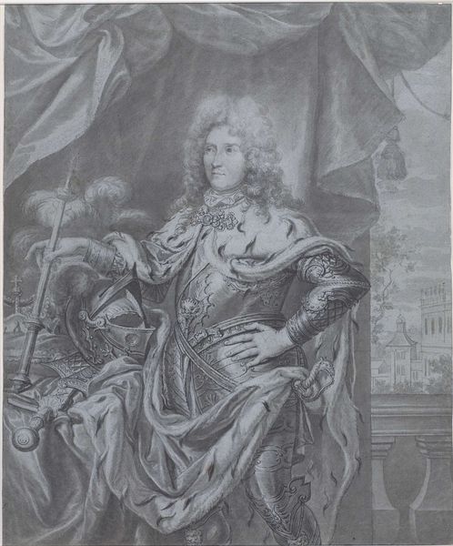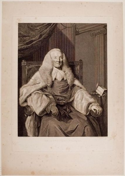 Curator: What a study in contrasts! The textures alone, from the sheen of the dress to the deep shadows in the drapery, create such a vibrant surface. Editor: Agreed! It’s fascinating to see how Schmidt, born in Berlin (1712-1775), used the print medium to translate the Czarina’s power. Consider the political ramifications of this portrait, "Elizabeth the First, Czarina of Russia," reaching a broad audience. Curator: Absolutely, especially when we consider the labor involved in creating these prints. The plates, the inks, the paper… it all speaks to an expanding industry and the material culture of image production. Editor: And it’s not just about production. The portrait itself reinforces Elizabeth's legitimacy, visually tying her to concepts of imperial authority through carefully chosen details and their distribution across social strata. Curator: Yes, even the way she holds the scepter seems less about individual prowess and more about embodying a system of governance. Editor: Exactly! This print acted as a powerful tool to legitimize her claim and shape her public image—an early instance of political branding on a mass scale. Curator: Looking at it this way definitely shifts the focus from simply aesthetic appreciation to understanding the broader scope of production, consumption, and dissemination. Editor: Indeed, and these historical insights can change how one appreciates its surface qualities as well.