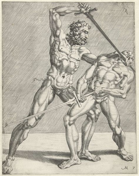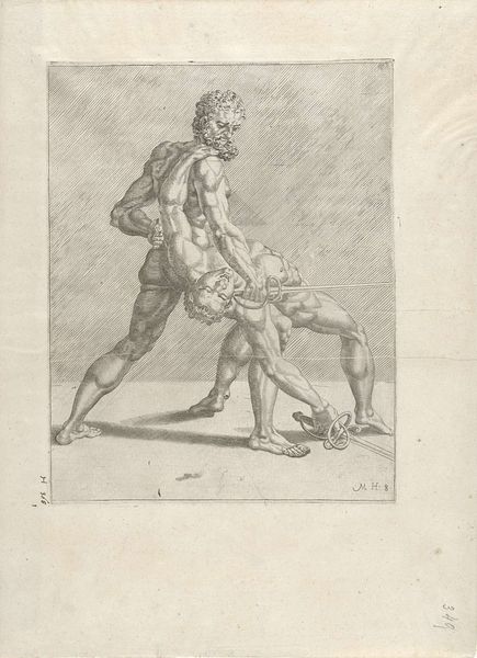 Editor: So, this is "Two Fencers, from Fencers, plate 8," made by Dirck Volckertsz Coornhert in 1552. It's an etching, quite graphic, with strong lines. What do you make of this depiction of physical dominance? Curator: It immediately brings to mind the social context of the Renaissance. This print wasn't just about illustrating fencing; it participated in the ongoing dialogue around humanist education. Editor: Humanist education? Curator: Absolutely. Physical prowess, especially among the elite, was a vital component. The idealized male nudes evoke classical ideals, recalling Greek wrestling matches, and athletic competition in general. This would have resonated deeply with the print's intended audience, who saw value in the synthesis of mind and body. But, let’s also consider the politics of imagery, because this image normalizes ideals of masculinity and might even represent male on male love that had to be codified for social acceptability. What else stands out to you about its style and historical reference? Editor: I noticed how dynamic the line work is, especially when you realize this is an etching; and now you're saying this idealized portrayal would have bolstered a certain image the elite wished to project. The fencers' actions and poses become a kind of display? Curator: Precisely. The distribution and reception of these kinds of prints by collectors certainly shaped the cultural understanding of skill, athleticism, and ideals about manliness in Renaissance society. The plates became models for artistic interpretations across media for years to come. Editor: It’s amazing how something that looks like a simple scene contains so much about social and political life at the time. Curator: Yes, studying this print is more than a view of fencing, it reveals a world where images played an active role in constructing and reflecting elite masculinity. Editor: Thanks, I have to rethink everything I considered about imagery of masculinity from now on.