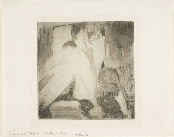 Curator: Here we have Anders Zorn’s "Sunday Morning", an etching from between 1892 and 1894, currently residing at The Art Institute of Chicago. Editor: My initial reaction is…intimate. It feels like we're intruding on a very private moment, despite the rather public display here in the museum. There's a certain domestic vulnerability to it. Curator: Yes, Zorn’s print certainly conveys intimacy, which speaks to the broader rise of genre painting that romanticized everyday life. In its time, this slice-of-life portrayal provided insight into the social hierarchy and moral climate of Sweden. Editor: Absolutely. Looking closely, I notice the composition. The etching is stark, almost unfinished. The lines are so fragile. We see a woman in a long dress partially undressed, attending to her hair, while a second woman looks on nearby. I am struck by what this choice implies, as if there’s an unequal exchange between the two, or simply an early morning domestic tension? Curator: It’s worth noting that Anders Zorn was fascinated with portraying women, often showing them in moments of naturalism. We should examine how Zorn's own artistic fame helped cement perceptions of women’s labor at the end of the nineteenth century. Who benefits when these images circulate, after all? Editor: Good question. By capturing a "Sunday Morning", perhaps he attempts to legitimize the female domestic space within a high art context. It makes me wonder about labor distribution and expectations of gender roles that we, even now, continue to project onto our domestic arrangements. Curator: The fact that it’s rendered in etching speaks to accessibility and a broader consumption. As a print, "Sunday Morning" could reach audiences that larger oil paintings wouldn’t. Therefore, in this format, the subject of female intimacy gains further currency, no? Editor: Indeed. I am now aware of my own subjectivity while absorbing its themes. Curator: So as we conclude our time at "Sunday Morning", hopefully it sparked in you a reevaluation of familiar spaces within shifting sociohistorical frameworks. Editor: Precisely. Thank you for challenging our traditional viewpoints to make room for more dynamic interpretation of what exactly lies hidden and illuminated within these artworks.