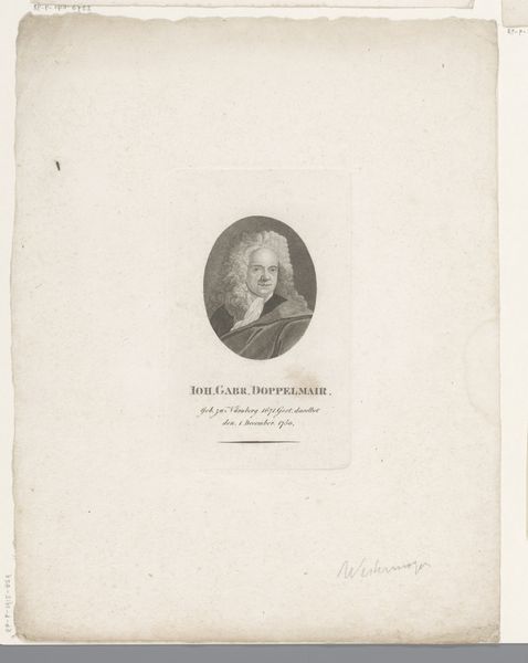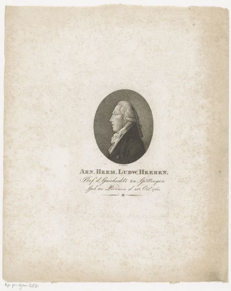 Curator: Good morning. Let's examine this piece, "Portret van Franz Benedikt Hermann" attributed to Konrad Westermayr, created sometime between 1775 and 1834. It’s an engraving on paper. Editor: Yes, I see it! There's something so refined about this portrait. The pale palette and delicate lines almost feel like a ghost from the past. What do you see in this piece from a formal perspective? Curator: Note the deliberate placement of the subject within an oval frame, a compositional choice that immediately directs the gaze and emphasizes the subject's isolation. The subtle gradations achieved through the engraving technique give form to the face, revealing both structure and the effect of light. Observe how the white palette functions—not as mere absence of color, but as an active agent in articulating form and texture. Editor: I notice that the text below the portrait also plays a compositional role, almost balancing the weight of the figure. Is that something you also consider important? Curator: Precisely. The inclusion of text anchors the visual field. Its typographical characteristics also establish a relationship between the figurative and the linguistic elements. Now, consider the subject's attire: how does its Neoclassical style impact the reading of the portrait as a whole? Editor: That’s a really good point! The style of the clothing helps place it historically, but I guess I hadn't considered the way its classical references underscore the formal composure of the whole work. Curator: And indeed, by focusing on line, tone, and composition, the portrait speaks eloquently through form alone. Editor: This conversation has really helped me look at the work with fresh eyes and notice aspects that I would have otherwise overlooked. Thank you!