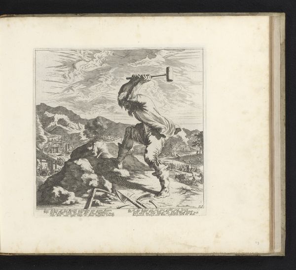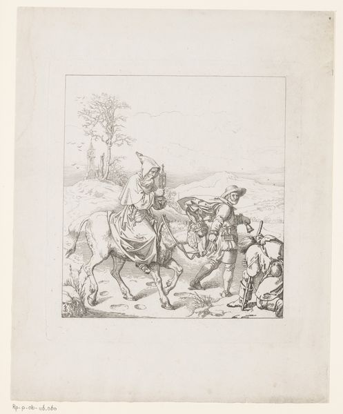 This is Horace Vernet's undated "Soldaat op een ezel," a drawing now held at the Rijksmuseum. The composition organizes the scene into receding planes, each populated with figures that diminish in scale, constructing a landscape that directs our gaze to the distant mountain. The artist employs hatching and cross-hatching techniques to define forms and create tonal variation, enhancing the sense of depth and volume. The soldier on the donkey, the most prominent figure, is rendered with careful attention to detail, with a certain degree of realism that reflects the artist's academic training. Yet, we might consider how the work destabilizes traditional military heroism. The soldier's undignified posture astride the small donkey creates an ironic commentary on the represented martial theme. The drawing invites us to examine the narratives it presents and to question the authority and the values they convey. It is not a simple depiction of military life but a complex layering of representation, inviting ongoing interpretation.