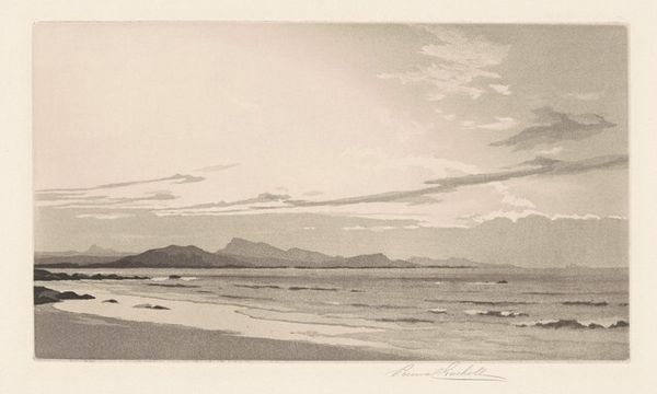 Editor: So, we are looking at “Low Tide,” an etching made in 1927 by Percival Gaskell. It's a very serene scene. The landscape is vast and flat, giving the impression of expansiveness and tranquility. What stands out to you when you look at it? Curator: What immediately strikes me is the romantic depiction of everyday life. Here we have the glorification of a mundane scene elevated to an art form. I am curious about Gaskell's intended audience. The accessibility of prints allowed for wider distribution of art outside elite circles. What do you think about the choice to depict an ordinary landscape? Editor: That’s interesting… I hadn’t really thought about the role of printmaking. I imagine people living in urban environments might find beauty and peace in these scenes of rural labor. Was there perhaps also some influence on the aesthetics, stemming from growing social awareness? Curator: Absolutely. We see this mirroring a broader trend of elevating rural life and labor. This echoes ideas within the Arts and Crafts movement and similar social reform movements where the values of simple living and connection to the land were embraced as an alternative to industrialization and its perceived dehumanizing effects. Do you think this piece embodies such sentiment? Editor: I think it could, definitely. I initially focused on the aesthetic of the image, but when viewed through a historical and social lens, the landscape becomes not just a place, but an idea of connecting people to something essential about nature. Curator: Exactly. And understanding these connections can offer greater insight into the context of art and its role in broader conversations and movements. Editor: I completely agree! I hadn’t initially considered this work in terms of its potential political implications but it certainly seems that appreciating it that way greatly enriches our perception.