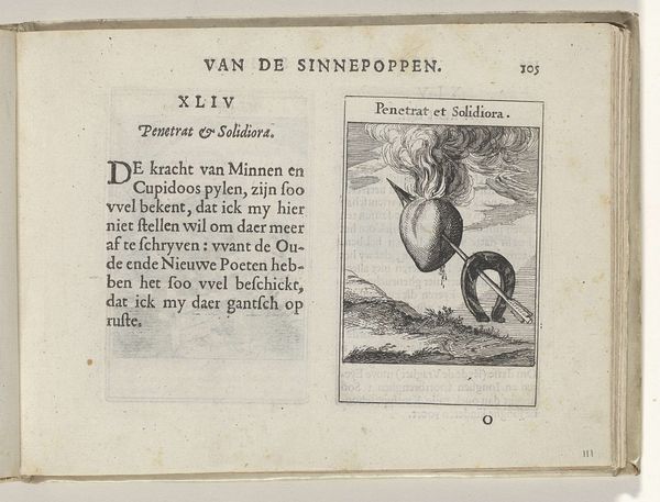 Curator: What a peculiar image—it feels like gazing into an old riddle book, doesn't it? This engraving, created in 1614 by Roemer Visscher, is titled "LII Vis mea de nihilo est," which, translated from Latin, means "My strength is from nothing." What jumps out at you? Editor: Initially, it’s this sort of paradoxical visual. A cannon, grounded on what appears to be a barren patch of land, juxtaposed with a block of dense text… There’s an immediate sense of imposed authority. The Latin phrase echoes themes of power emerging from emptiness, which brings into focus ideas surrounding colonialism. The canon is often used as the object that facilitates the expansion of colonial states through violence. Curator: You’ve immediately tapped into something powerful there. Visscher offers this visual puzzle alongside the enigma in both Latin and Dutch, and further implies that Vulcan, Nature and Minerva somehow conspire to produce this. The cannon itself is rendered so meticulously, almost lovingly—one can practically hear the echoes of its boom… it's troubling, that blend of aesthetic appreciation with the implied violence. Editor: Right, the details invite scrutiny—the perfectly turned wheel, the suggestion of distant skies. And Visscher uses text to claim art comes to be with the power of Vulcan, Nature and Minerva but then also describes the nature of “nothingness”, suggesting this power stems from nihility itself. This raises some questions surrounding the ethical issues concerning from where artistry and creative influence stems. Is Visscher interrogating the creation of art and ingenuity from violence, “nothingness?” Curator: It also seems the power dynamic is very literal. The power being in the cannon, ready to use force in exchange for colonization of Indigenous people and resources… Editor: Exactly, and framing it with “strength from nothingness” and alluding to higher powers allows colonizers to believe their conquest is divinely sanctioned. It gives their destruction a clean origin—*nothing*, which is the absence of everything else and seemingly justifies it. Visscher may be trying to subtly unpack this rationale. Curator: So, through a deceptively simple engraving of a cannon accompanied by a clever little verse, we confront the brutal ironies of power and creation, where strength claims to arise from nothingness. Editor: Precisely. An image that, once situated within its socio-historical context, prompts profound reflection on how empires justified exploitation, framing violence not as an end but as an inexorable element for creative ingenuity, all the way down to art making itself.