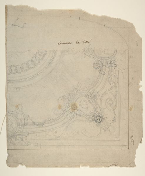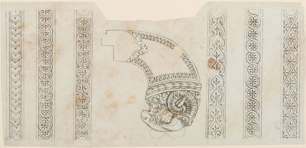 Curator: Immediately, the delicacy strikes me. The linear precision contrasts so fascinatingly with the organic nature of the design. Editor: Here we have "Ontwerp voor achthoekige broche met opengewerkte bladertakken," or "Design for an octagonal brooch with openwork leaf branches," attributed to Henri Cameré and dating roughly from 1864 to 1894. It’s rendered with ink and coloured pencil on paper. Curator: It's evocative of that burgeoning Arts and Crafts aesthetic, a real sense of craftsmanship married with an almost medieval heraldic sensibility. Are those griffins flanking the design? There's an appealing symmetry, too. Editor: Absolutely, you can really see the principles of the Arts and Crafts movement at play. Notice the emphasis on handcrafted design—this wasn’t about mass production, but highlighting the skill and labor involved in creating something beautiful. It’s so clearly designed to showcase meticulous work, and the relative cost for someone acquiring such work during its moment. Curator: That openwork—literally piercing the metal to reveal the negative space—speaks volumes. The stylized leaves wrapping around, almost embracing those heraldic figures, really grounds the composition, lending a tangible sense of symbolic protection, wouldn’t you agree? Editor: Definitely protection, I am glad you say so. I'd also push the materials aspect; consider the actual brooch in precious metal, perhaps silver or gold, and the social signaling it enables as status object. These luxury pieces often reinforced very established power dynamics through adornment. It seems very clear that Cameré had patrons from the aristocracy. Curator: Yes, one could explore that thread! But the enduring visual language! How those design principles are embedded in our collective aesthetic memory, consistently resurfacing in modern design! Even today, there's this powerful subconscious resonance with its form, right? Editor: Yes, seeing the way the design becomes an actual material piece—considering that act of labour, who is included, excluded in that process gives me plenty to continue pondering.