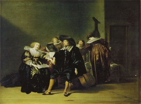Curator: This is "A Musician and His Daughter," painted in 1629 by Thomas de Keyser. It currently resides at the Metropolitan Museum of Art. What are your initial thoughts? Editor: It’s quite striking, particularly the textures. Look at the sheen of the father’s black garments compared to the duller, yet intricately patterned fabric of the daughter’s dress. I'm drawn to the materials used to construct those garments. Curator: Absolutely. De Keyser’s portrait opens a fascinating lens into the social fabric of 17th-century Dutch society, highlighting the significance of music in shaping familial identity. It’s worth exploring the father’s stance, almost mid-performance, and how it reinforces notions of masculinity and artistic expression within a patriarchal structure. Editor: I agree that the father's stance dominates the painting. Note also the placement of his instruments—foregrounded. This wasn't casual, of course; each item had a particular value in trade and in social circles. And I would bet there was a lively market in Amsterdam at the time for the various dyes needed for garments of these types. Curator: Consider the symbolism of the musical instruments as tools for social mobility, but also potentially reinforcing gendered roles. The daughter is presented more passively, symbolizing a woman’s expected decorum versus the father's active creative participation. We could see this piece as an examination of social constraints. Editor: Agreed, it does raise these questions. Still, I want to go back to the craftsmanship of the time. I can imagine the intense labor involved in producing those textiles. And beyond labor—I’m wondering where De Keyser got the paint pigments for such detail and range of expression? It gives the artwork even further depth, realizing that this moment of time was carefully considered not just in setting, but materials too. Curator: A wonderful point; it allows us to broaden the conversation of the subjects presented here within a complex cultural hierarchy. It shows how the construction of social identity, gender dynamics, artistic performance, and material existence are all interconnected and reinforce existing political structures. Editor: Precisely. By understanding the artist’s choices, especially material ones, we can reveal the nuances of the social world he inhabited and, crucially, reveal its power dynamics as well. Curator: A valuable perspective! Thank you. Editor: My pleasure.