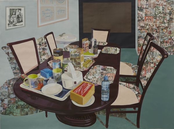 Curator: Here we have Benny Andrews' 1965 mixed-media painting, "Dinner Time." What strikes you first? Editor: It's undeniably poignant. A scene of communal eating under what seems like difficult circumstances. There’s a powerful simplicity in the composition that tugs at something primal. The flattened perspective almost pushes the figures toward us, demanding we bear witness. Curator: Andrews, who was deeply engaged with the Civil Rights Movement, often used art as a form of social commentary. He frequently depicted scenes from everyday African American life, challenging the stereotypical portrayals prevalent in mainstream culture at that time. His focus wasn't necessarily about illustrating joy, but authenticity. Editor: Absolutely. Look at the figure tending the stove – there's a weariness, yet a quiet strength. It reads to me like labor inequity right away. While three men dine, she is standing tall doing labor and overseeing all aspects of care. This woman could also very easily symbolize all black women forced to work while men in her family do not help with household labor. Curator: Consider also the materials. The roughness of the mixed media—perhaps scraps of fabric incorporated—echoes the resourcefulness required to sustain life amidst socio-economic hardship. In the art world then, many would rather look at expensive, representational oil paintings. To include these kinds of found elements subverts expectation, forcing us to value something new. Editor: I agree, and that material element connects so beautifully with the social commentary. What is this painting teaching the white, bourgeois art critic? It refutes that "fine" art can only come from pristine materials and traditional forms, just as Andrews' narrative challenges ingrained biases about Black lives. Curator: Andrews was acutely aware of the art world's biases, his aesthetic decisions actively questioned institutional norms and whose stories mattered. And still matters today, right? Editor: Certainly, "Dinner Time" is an example of work that insists on visibility, disrupting established narratives. It demands acknowledgement, not just of the figures depicted, but the countless untold stories that they represent. It is in conversation with systemic barriers and demands equality today, still. Curator: Precisely. Viewing it through this lens deepens our appreciation. We realize "Dinner Time" is much more than a simple domestic scene, isn’t it? Editor: I’ll never think of a simple dinner the same way. It really pushes us to interrogate power, labor, and the untold narratives shaping marginalized people's lives.