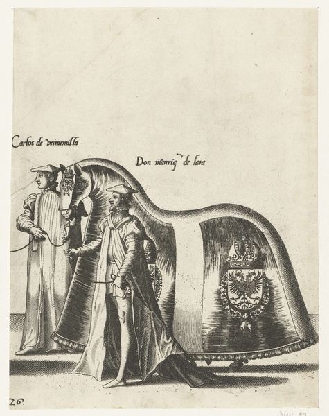 Joannes van Doetechum created this print, "Deel van de optocht, nr. 22-23," circa 1532, using engraving. The work's striking formal qualities, particularly its use of line and composition, create a world of controlled pageantry. Consider the way Doetechum arranges figures and symbols; banners, each bearing an imperial eagle, frame a central tableau of dignitaries and a horse in ceremonial armor. Notice the interplay of horizontal and vertical lines. Vertical flagpoles bisect the composition, while horizontal banners extend the visual field. This structured approach reflects an interest in order and hierarchy. The meticulously engraved lines convey a sense of precision, but also hint at a world defined by power and status. This work is not merely a record of a procession, but a visual encoding of social and political relationships through form and symbol. As such, each formal element contributes to the viewer’s understanding of the values that underpin this society. By considering the arrangement of line, space, and symbol, we can explore the cultural codes embedded within this carefully constructed image.