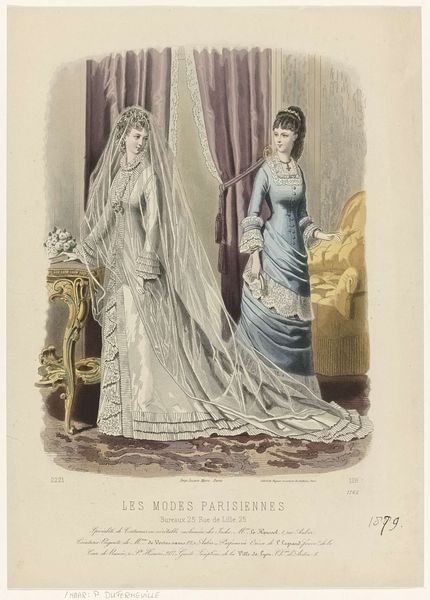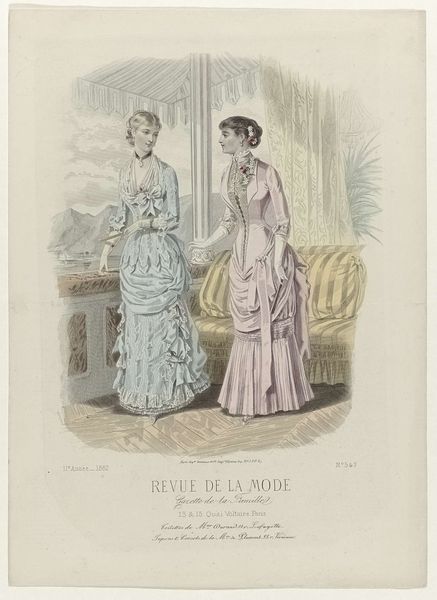Editor: Here we have E. Cheffer's watercolor illustration from 1882, titled "Revue de la Mode, Gazette de la Famille." It depicts two women in elaborate gowns. I'm struck by the image's attention to detail; you can almost feel the texture of the fabrics. What stands out to you? Curator: I find myself considering how this image functions within its original context. This wasn't simply an artistic expression; it was a fashion plate, existing within a specific socio-economic structure. How did periodicals like "Revue de la Mode" shape ideals of femininity and social status in late 19th-century France? Editor: That's a great point. The clothing is obviously a display of wealth, but also conformity, perhaps? Do you think it was aimed at influencing consumers directly, or at influencing popular imagination about what was stylish? Curator: It's both, I think. These illustrations acted as aspirational blueprints. The women depicted become ideals but the magazine itself would be feeding into a larger machinery, setting these sorts of constraints. Who gets to decide the rules and benefits, and who does it hurt? And what sort of behavior becomes normalized as a result? Editor: I never really considered all that background, how the creation and the dissemination of images affect our values. Curator: Exactly, these images circulated in a specific social sphere and time, influencing and reinforcing contemporary norms and aspirations. Editor: Well, thanks! This conversation has given me a richer understanding of not only this specific piece but also how to read art with greater socio-historical awareness. Curator: My pleasure! Reflecting on these intersections offers new lenses through which to examine art's enduring influence on shaping our world.