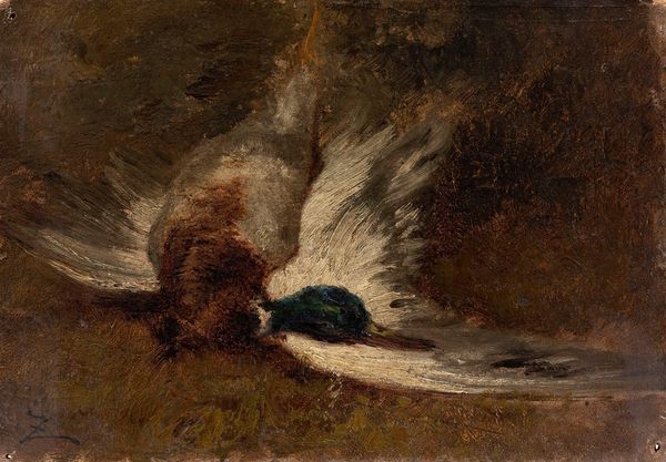 John Atkinson Grimshaw painted "A Dead Linnet" in oil on panel, presenting a somber yet compelling visual experience. The eye is immediately drawn to the lifeless bird, its muted green and yellow feathers contrasting starkly with the dark, earthy tones of the surrounding foliage. The composition is structured around a subtle interplay of textures. The smooth feathers of the linnet lie against the rough textures of the ground, scattered with pebbles and dead leaves. In the backdrop, Grimshaw uses dark browns to depict ferns and a single ivy leaf, enhancing the sense of depth and decay. The use of this type of symbolism invites interpretation through the lens of semiotics, where natural elements become signifiers of mortality. The formal qualities of this painting—the attention to detail, the contrast between light and shadow, and the subdued palette—reflect broader artistic and philosophical concerns of the Victorian era. It invites contemplation about the transience of life and the inevitability of decay, making it more than just a depiction of death, but a meditation on existence.
