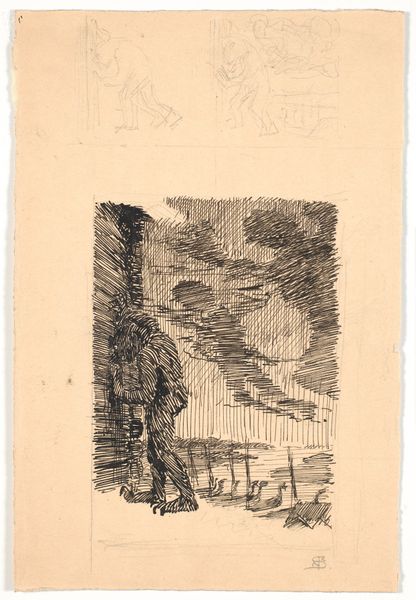 Pieter de Josselin de Jong created this image of a sunken road with a horse and rider using graphite pencil, likely at the end of the 19th century. It’s a work that evokes the quiet solitude of rural life, yet it also subtly speaks to broader social and economic currents. In this drawing, we see not a grand landscape, but a humble, everyday scene. The choice of such a subject can be seen as a reflection of the artist’s connection to the common person, and the rise of Realism in art during this time. The subdued tones and somewhat somber atmosphere may suggest the weight of labor and the often unseen lives of those who worked the land. The rider, shrouded and anonymous, could be anyone, and perhaps that's the point. There is a quiet dignity in the everyday. It asks us to consider the humanity and the stories embedded in these ordinary moments.