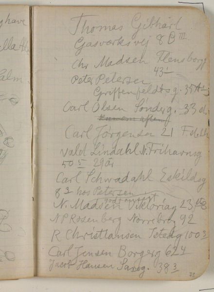 Curator: Here we have Niels Larsen Stevns’ work titled "Adresser" completed between 1937 and 1938. It’s currently part of the collection here at the SMK, made using pencil on paper. Editor: My first thought? This isn't just art, it's a time capsule! It feels incredibly personal, like I'm holding someone's intimate record of connections, little scraps of their daily life laid bare on this aged paper. Curator: Indeed. What we are looking at appears to be a page from an address book or notebook. Stevns’ decision to present this as a work of art elevates it beyond the mundane, doesn’t it? It also makes you think about the broader socio-political backdrop of Denmark in the late 1930s as he made the work. Who were these people? Were they artists, patrons, friends? How might have history treated them? Editor: It does! The almost careless scribbles make it intimate; names jotted down with an urgency, numbers scrawled, creating a tangible presence of those individuals. Pencil on paper emphasizes the fleeting nature of memory. Will these contacts endure, like this fragile page we are admiring today? And I love how seemingly ordinary this is; no pretension, no staged portraits; the absolute opposite of formality. Curator: The simplicity you highlight allows it to resonate even today, decades removed. This work presents itself not only as an aesthetic object, but as a piece of social history – an artifact that connects us to another time. Editor: Absolutely, you put that perfectly! And in viewing this, one wonders about how transient all our contact lists and connections are in today’s digital landscape. Are we collecting contacts or truly building connections that will stand the test of time? Okay, heavy thoughts for a casual notebook scribble, but here we are. Curator: That resonance is precisely what solidifies the artwork’s long-lasting public and cultural value. And hopefully what ensures future generations consider it too. Editor: I love that… a lovely consideration and lasting reflection. Thank you!