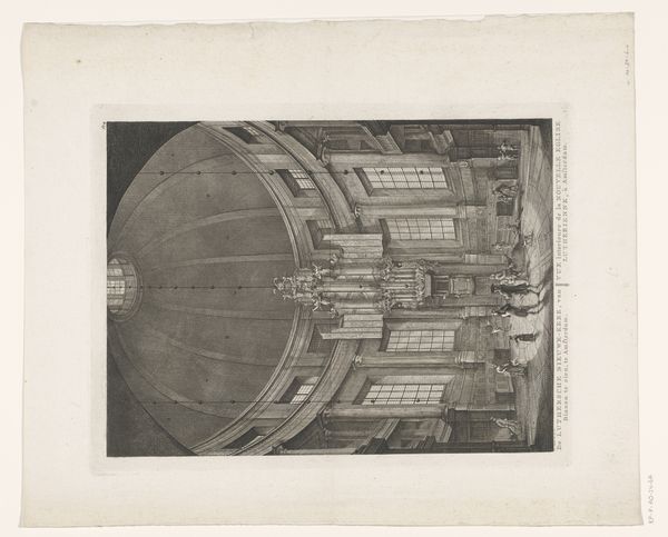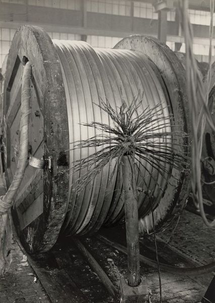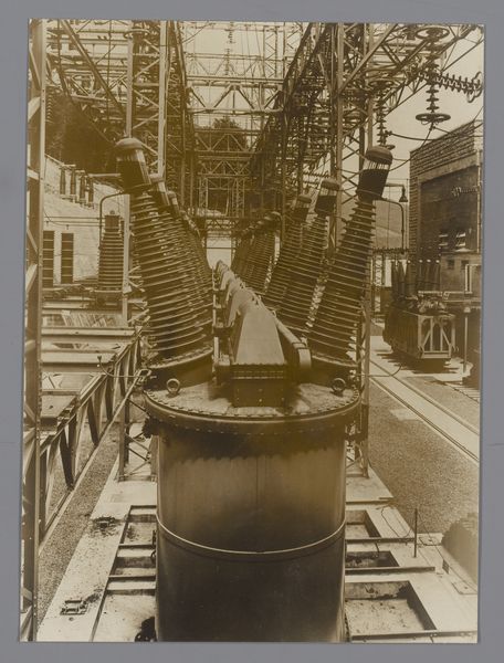 Curator: Let's talk about this photograph titled "Serpentijnkookpan," dating from between 1925 and 1935. It is currently held in the collection of the Rijksmuseum. Editor: My first impression is one of being swallowed. Those concentric rings, the dark tonality… it's both impressive and a little oppressive. Curator: Right? What really grabs me is the material reality it presents. The anonymous photographer captured this immense coil, presumably for industrial purposes, but the aesthetic qualities are undeniable. The repetitive structure of the coil speaks to processes of mass production and fabrication in this era. Editor: I find myself drawn to the image's inherent symbolism. The spiral is a potent form across cultures. This vortex shape, this suggestion of constant circulation… it speaks of energy, potential, perhaps even hidden depths and unknowable forces. It even echoes certain mythical serpent imagery. Curator: I suppose the title nudges us in that direction. The work's value as a photograph lies precisely in how it frames industrial architecture and manufacturing. Notice how the textures in the image give evidence of manual work on an immense scale. I’m fascinated by the human scale in relation to it all: you can spot a person standing next to it. Editor: Exactly, it provides context, like an acolyte standing next to a monument, to understand its dimensions. The circles also bring to my mind a symbol of wholeness and containment, perhaps an effort to tame those immense powers the materials may be put to? What effect was it intended to have? Curator: Without further documentary material, all we can do is to suppose. In its textures and patterns, there's beauty, purpose, and the story of industrial labor carefully observed and frozen in time. Editor: An object imbued with meanings then. On a personal level, looking into the circles makes me reflect about the way history and its meanings tend to come back at you. Curator: Well said! It seems the photograph succeeds in being simultaneously descriptive and subtly evocative, an arresting composition.