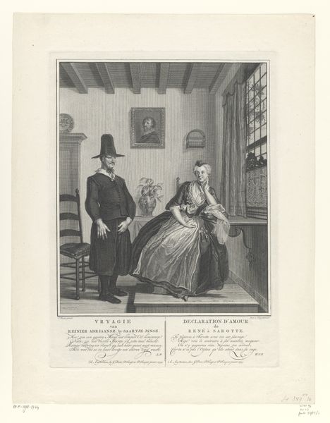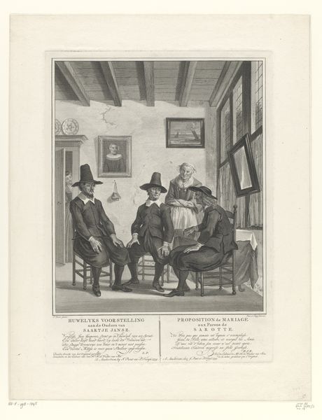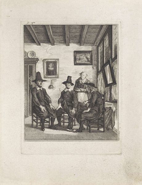 Editor: This etching, titled "Drie mannen in overleg terwijl een jonge vrouw in de deurpost meeluistert"—quite a mouthful, but roughly translating to "Three men in consultation while a young woman eavesdrops in the doorway"—was created sometime between 1745 and 1794. I find the scene intriguing, almost theatrical. What can you tell me about the context of such a piece? Curator: It’s indeed theatrical. Looking at this image through a historical lens, several aspects come into focus. Firstly, consider the power dynamics being represented. We have these presumably Puritan men deeply engrossed in discussion, while the woman is relegated to eavesdropping, literally on the periphery. What does this staging say about gender roles within the societal context of its creation? Editor: It speaks volumes about the limitations placed upon women, relegated to the margins. It’s interesting how the print visually reinforces that societal imbalance. Curator: Precisely. The print, through its deliberate composition, acts as a commentary on societal structures. It uses genre painting conventions to potentially critique the very society it depicts. Do you notice any visual clues, maybe the placement of objects or people, that further emphasize a power imbalance? Editor: Well, the overturned picture frame creates an off-kilter feeling. And even the way light and shadow falls seems to prioritize illuminating the men in consultation, obscuring the young woman in the doorway. Curator: Good observations. Also consider that prints like these had a public role; they were often mass-produced and disseminated widely. Think about how this image might have been interpreted by various audiences during that period. Whose perspectives were being validated and whose were being questioned? Editor: I hadn’t considered the print’s widespread potential impact. It could have been used as either a cautionary tale or a confirmation of existing societal norms. Thinking about its distribution really shifts my perception. Curator: Exactly! Art doesn’t exist in a vacuum. Exploring the social, cultural, and institutional contexts reveals the many layers of meaning embedded within it, enriching our own understanding. Editor: Absolutely, considering the potential audiences of that time changes my reading of this considerably. Thank you!