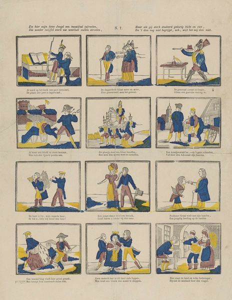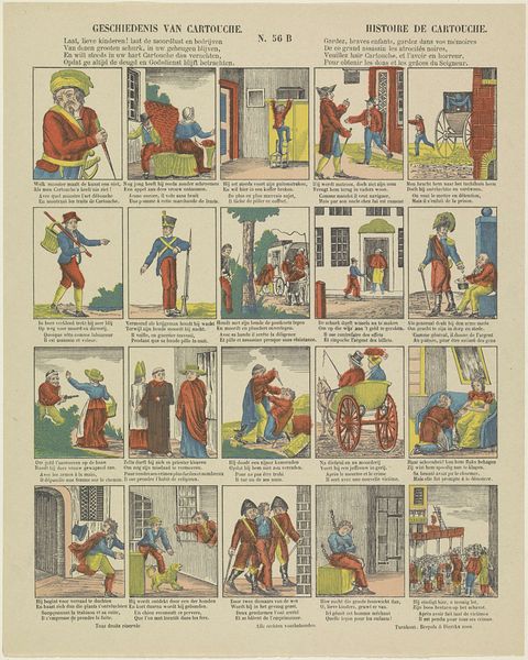 This cautionary print, made by Lutkie & Cranenburg, presents a series of scenes illustrating the misdeeds of a villain. Notice the repeated motif of theft and violence throughout the images. These are visual representations of moral decay, intended to instill in children a fear of straying from the path of virtue. Think of these images as morality plays, a common trope in visual culture through the ages. This didactic approach can be traced back to medieval morality plays, where characters embodied abstract concepts. The scenes here share a lineage with similar cautionary tales found in different cultures and eras, illustrating the timeless human struggle between good and evil. These depictions reflect a collective fear of social disorder, tapping into a deep, subconscious desire for structure. The print serves as a vivid reminder of how cultural anxieties manifest themselves visually, evolving through time and reflecting society's changing values while still echoing perennial themes.