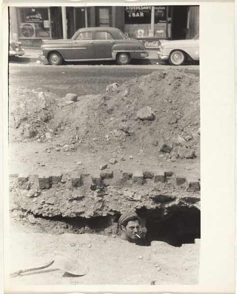 Robert Frank made this photograph, Road Construction--New Haven, Connecticut, using gelatin silver print. I’m drawn to the rawness of Frank's approach. The grainy texture and stark contrast create a feeling of immediacy, like a snapshot taken on the fly. You can almost feel the grit of the street and the weight of the air. There’s a sort of narrative tension in the composition. The couple is in the center, a man and a woman, seemingly gazing into the hole. The barricades and the ‘Danger’ signs create a sense of unease, while their embrace suggests a search for comfort amid this chaos. This photograph reminds me a little of the paintings of Philip Guston, where everyday objects and scenes are rendered with a similar kind of rough, almost clumsy quality. Both artists seem to be grappling with the complexities of modern life. Ultimately, this image resonates because it acknowledges the messiness and ambiguity of the human experience.
