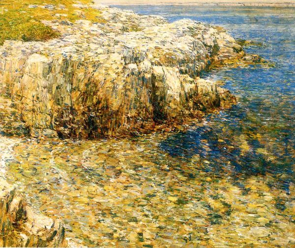 Childe Hassam painted 'Walk Around the Island' in 1890 using oil on canvas, and its surface buzzes with vibrant energy. The composition rises diagonally, structured by a rustic wooden fence that bisects the scene, leading the eye upwards towards a scrubby, rocky landscape under a bright sky. Hassam’s broken brushstrokes and the high-key palette create a shimmering effect, evoking a sense of light and atmosphere. The scene avoids traditional linear perspective, emphasizing instead the interplay of color and texture to define form. This technique aligns with the Impressionist interest in capturing fleeting moments and subjective visual experiences. Hassam was playing with the semiotics of landscape painting, challenging the conventional hierarchy between the natural and the artificial by including the fence. It questions our perception of nature as purely pristine, suggesting instead that human intervention inevitably shapes our view. This tension between nature and artifice invites the viewer to consider the constructed nature of landscapes and the role of human perception in shaping our understanding.
