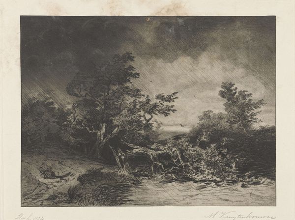 Editor: This etching, titled "Storm," was created by Martinus Antonius Kuytenbrouwer Jr. between 1831 and 1897. The scene feels incredibly dramatic, the diagonal rain lines and gnarled trees evoke a real sense of turbulence. What strikes you when you look at it? Curator: The drama is palpable, isn't it? For me, it’s the lone tree, bending against the storm, that anchors the piece. Consider how often trees serve as symbols of resilience, growth, and connection to the earth in various cultures. Does this image speak to you in that way? Editor: Yes, it definitely does. I hadn’t considered it quite so literally. The fact that it’s the only tree really brings that point home. Curator: And what of the minuscule boat on the left? What sort of emotional reaction does this element invoke for you? Editor: I think that adds to the feeling of vulnerability... the people are so small against nature's overwhelming power. Maybe that contrast highlights humanity's relationship to the natural world, that struggle for survival and a yearning for freedom. Curator: Precisely. It is Romanticism, after all. And the lines, they are evocative in how they delineate both calm and chaos, a reminder that even in moments of discord, underlying structures persevere, isn’t it? Editor: That’s a very astute observation! I was so focused on the drama I didn’t see the inherent order. Curator: Understanding these historical echoes allows us to connect more deeply with art. I see cultural continuity through symbols. What do you take away? Editor: I appreciate how much context informs our viewing experience. I’ll never look at a stormy landscape quite the same way.