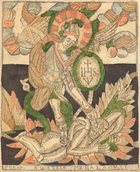 Curator: My first impression is quite arresting. The simplicity of line coupled with the vibrant geometry creates a piece that is quite striking, doesn't it? Editor: It does indeed. This is a print, "The Holy Ghost," created sometime between 1460 and 1470 by an anonymous artist. It's rendered with ink, tempera, and possibly other drawing media. Notice the central dove, a traditional representation of the Holy Spirit. Curator: Ah, the dove, bursting forth with these geometric, zigzagging wings and that halo like stylized sun rays. The anonymous artist cleverly abstracts the natural form of the bird. And consider the repetitive zigzags! The emotional impact for period audiences might be the volatility of divinity... Editor: Indeed, I believe there's an active theological encoding there. The Holy Spirit is often linked to revelation, sudden understanding. Perhaps the starkness represents something revelatory about the medieval period itself. What else stands out to you? Curator: The composition certainly favors clarity of message over realistic portrayal. I detect little naturalism, which redirects our reading. Everything is pointed inward: notice the bird's beak is open; what truth does it cry to be heard? It feels so raw... Editor: An interesting perspective. I would simply add how the limited palette of dark outlines filled with hues—yellow, white, pink, beige—amplifies the piece's sense of otherworldly beauty and perhaps, the accessibility of faith during the medieval age. Curator: I'd have to agree; those colors seem deliberately chosen to engage people visually. Editor: It's the visual equivalent of stained glass in a miniature form, perhaps. After having scrutinized this piece and its historical meanings, it evokes for me that moment of faith that transcends tangible experience. Curator: For me, it leaves an impression of the divine actively piercing into earthly reality—perhaps the artist's intended effect.