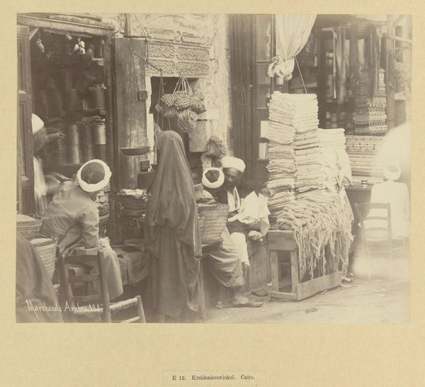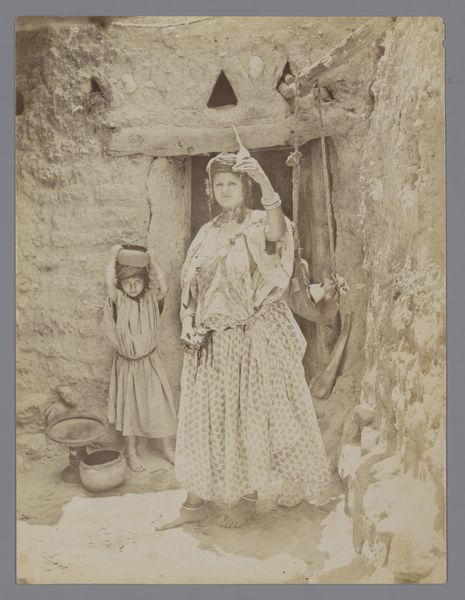 This stereo card, a photograph titled "Vrouwen vermalen graan te Nazareth," presents a double vision of women grinding grain. It's a fascinating look at a moment captured by an anonymous photographer. There's something about the way the image is rendered in sepia tones that gives it a tactile quality, like an old drawing. Look at the way the light defines the shapes of the women and their tools, how it creates a sense of depth and texture in the scene. It reminds me of how an artist might use layering and shading to build up an image, revealing the underlying structure. Notice the contrast between the smoothness of the grinding stones and the rougher textures of the clothing and the landscape. Each element contributes to the overall feeling of the piece, and the way they play off each other creates a kind of visual rhythm, like a conversation between different voices. It's as if the photographer is inviting us to engage with the image on multiple levels, to see it not just as a representation of a scene, but as a dynamic and evolving process. I'm reminded of the work of someone like Agnes Martin, who also explored the subtle nuances of texture and color to create a feeling of depth and resonance.