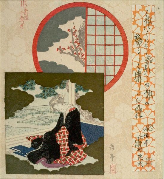 Editor: Here we have Yanagawa Shigenobu's "Noble Lady in New Years Attire." The patterning and color are really striking, but there's also a melancholy to her posture. What symbols stand out to you in this piece? Curator: The fan, the kimono, the calligraphy… all are potent symbols. The fan, for example, can represent one's fate, unfolding with each pleat. Notice how she holds it, almost shielding herself. Editor: That’s interesting, I hadn't considered the fan in that light. Curator: Consider also the New Year context. It's a time of renewal, yet she seems withdrawn. What might the artist be suggesting about the role or expectations placed upon women of noble status in that era? Editor: It really makes you think about what's hidden beneath the surface, doesn't it? Thanks for illuminating that. Curator: Precisely! Visual symbols are never just decoration; they're echoes of culture and individual experience.