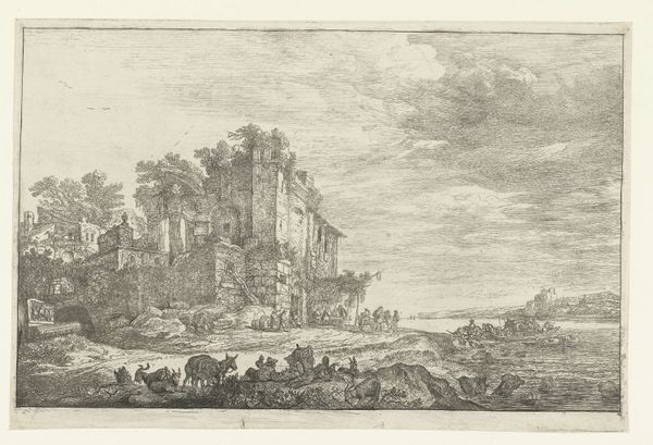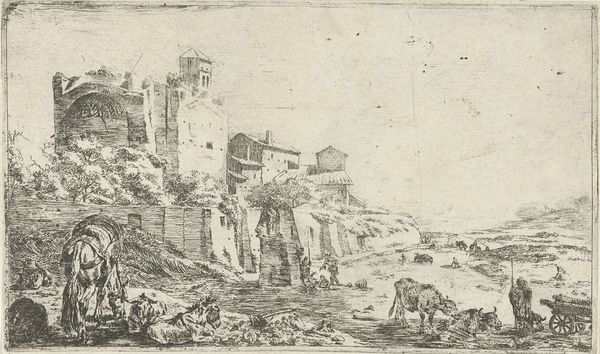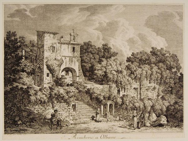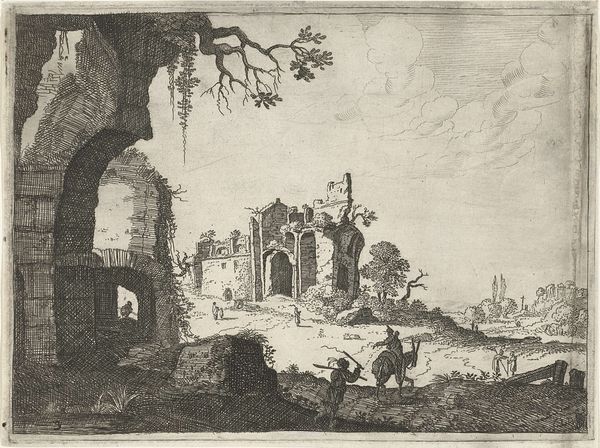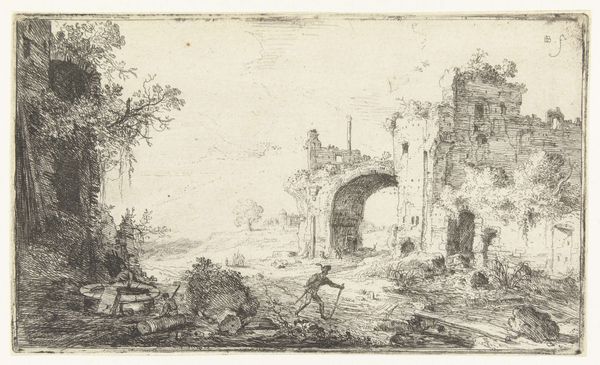 Editor: Here we have "The Ruins of an Aqueduct" by Bernardo Bellotto. It's tough to pin down the exact date. The etching has a somber, almost desolate feel, despite the figures. What strikes you about the composition? Curator: I am drawn to the stark contrast between light and shadow, wouldn't you agree? Note how Bellotto uses hatching to create depth. The aqueduct itself, while ruined, presents a strong, geometric form against the more organic landscape. Editor: I see that now, how the geometry creates a sense of solidity. Curator: Precisely. Consider, too, the relationship between the aqueduct and the figures within the composition; they serve to emphasize the scale and enduring presence of the structure. Editor: So, it's almost like the people are there to highlight the structure itself. Curator: It is a dialogue between form and space. Editor: I never thought of it that way before. Thanks!